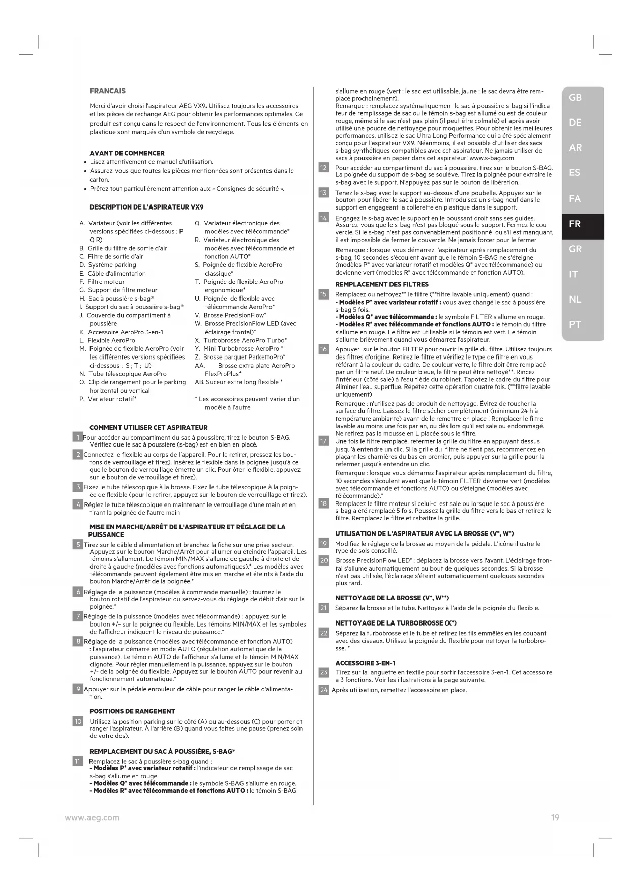 PT19 www.aeg.com FRANCAIS Merci d’avoir choisi l'aspirateur AEG VX9. Utilisez toujours les accessoires et les pièces de rechange AEG pour obtenir les performances optimales. Ce produit est conçu dans le respect de l'environnement. Tous les éléments en plastique sont marqués d'un symbole de recyclage.