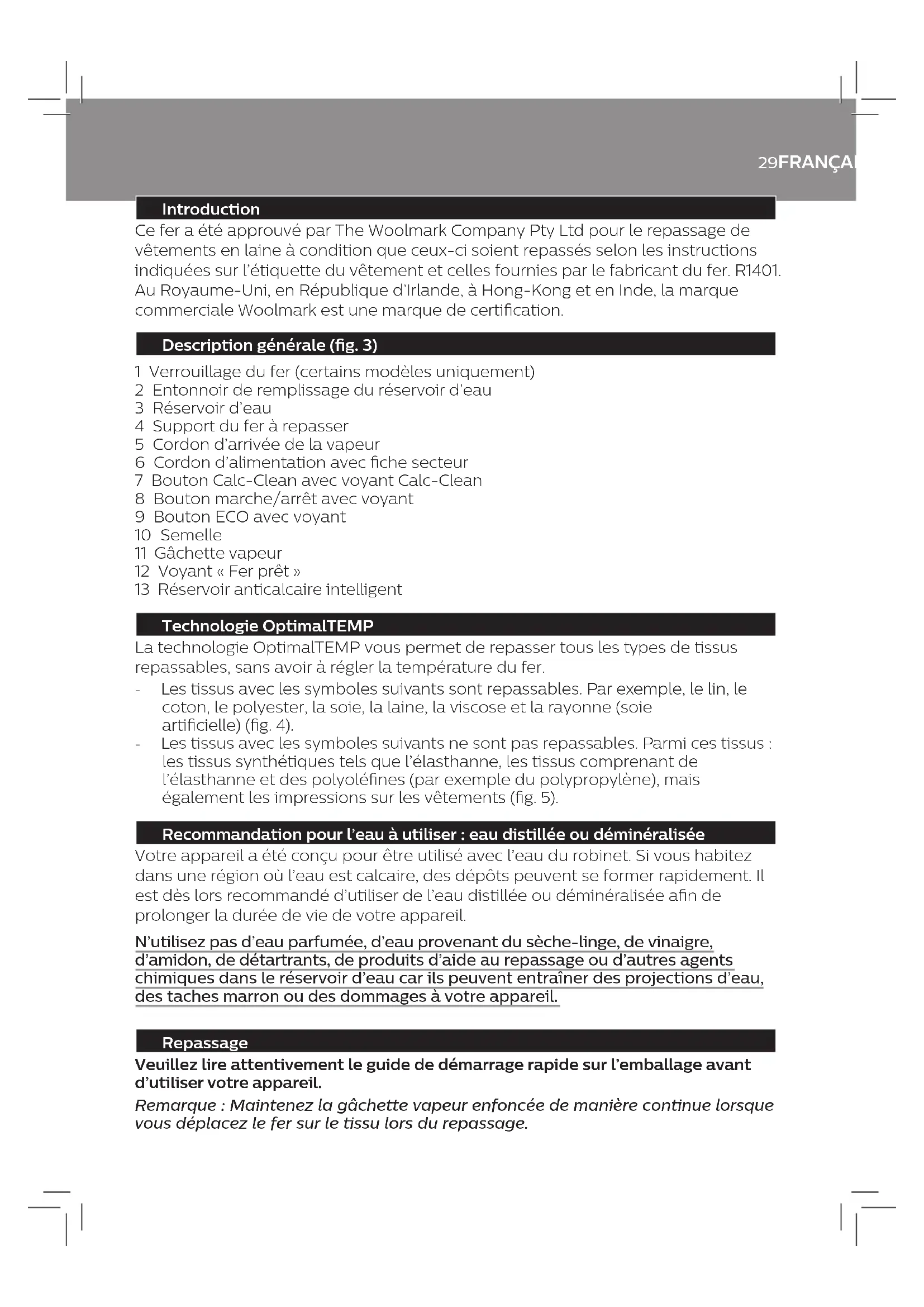 Introduction Ce fer a été approuvé par The Woolmark Company Pty Ltd pour le repassage de vêtements en laine à condition que ceux-ci soient repassés selon les instructions indiquées sur l’étiquette du vêtement et celles fournies par le fabricant du fer. R1401. Au Royaume-Uni, en République d’Irlande, à Hong-Kong et en Inde, la marque commerciale Woolmark est une marque de certication. Description générale (g. 3) 1 Verrouillage du fer (certains modèles uniquement) 2 Entonnoir de remplissage du réservoir d’eau 3 Réservoir d’eau 4 Support du fer à repasser 5 Cordon d’arrivée de la vapeur 6 Cordon d’alimentation avec che secteur 7 Bouton Calc-Clean avec voyant Calc-Clean 8 Bouton marche/arrêt avec voyant 9 Bouton ECO avec voyant 10 Semelle 11 Gâchette vapeur 12 Voyant « Fer prêt » 13 Réservoir anticalcaire intelligent Technologie OptimalTEMP La technologie OptimalTEMP vous permet de repasser tous les types de tissus repassables, sans avoir à régler la température du fer. - Les tissus avec les symboles suivants sont repassables. Par exemple, le lin, le coton, le polyester, la soie, la laine, la viscose et la rayonne (soie articielle) (g. 4). - Les tissus avec les symboles suivants ne sont pas repassables. Parmi ces tissus : les tissus synthétiques tels que l’élasthanne, les tissus comprenant de l’élasthanne et des polyolénes (par exemple du polypropylène), mais également les impressions sur les vêtements (g. 5). Recommandation pour l’eau à utiliser : eau distillée ou déminéralisée Votre appareil a été conçu pour être utilisé avec l’eau du robinet. Si vous habitez dans une région où l’eau est calcaire, des dépôts peuvent se former rapidement. Il est dès lors recommandé d’utiliser de l’eau distillée ou déminéralisée an de prolonger la durée de vie de votre appareil. N’utilisez pas d’eau parfumée, d’eau provenant du sèche-linge, de vinaigre, d’amidon, de détartrants, de produits d’aide au repassage ou d’autres agents chimiques dans le réservoir d’eau car ils peuvent entraîner des projections d’eau, des taches marron ou des dommages à votre appareil. Repassage Veuillez lire attentivement le guide de démarrage rapide sur l’emballage avant d’utiliser votre appareil. Remarque : Maintenez la gâchette vapeur enfoncée de manière continue lorsque vous déplacez le fer sur le tissu lors du repassage.30 FRANÇAIS IMPORTANT - Nettoyage et entretien Système anticalcaire intelligent Votre appareil a été pourvu d’un système anticalcaire intelligent an d’assurer un détartrage et un nettoyage réguliers et, ainsi, maintenir des performances élevées de vapeur et éviter que saletés et taches s’échappent de la semelle au l du temps. Pour garantir l’exécution du procédé de nettoyage, l’appareil indique des rappels réguliers. Outre cela, une deuxième étape de défense pour la protection de l’appareil contre le calcaire est intégrée : la fonction vapeur est désactivée si le détartrage n’est pas eectué dans un délai d’1 heure de repassage à la vapeur à compter du rappel. Une fois le détartrage eectué, la fonction vapeur est restaurée. Ceci se produit indépendamment du type d’eau utilisé. Rappel sonore et visuel de détartrage - Après 1 à 3 mois d’utilisation, le voyant du bouton Calc-Clean commence à clignoter et l’appareil commence à émettre des signaux sonores pour indiquer que vous devez exécuter le traitement anticalcaire (g. 6). - Vous pouvez poursuivre le repassage à la vapeur pendant 1 heure à partir du moment où le voyant Calc-Clean clignote et l’appareil émet de signaux sonores. Une fois ce délai écoulé, la fonction vapeur est automatiquement désactivée. Vous devez alors exécuter le traitement anticalcaire avant de pouvoir poursuivre le repassage à la vapeur. (g. 7) Exécution du traitement anticalcaire avec le réservoir anticalcaire Ne laissez pas l‘appareil sans surveillance pendant le traitement anticalcaire. Exécutez toujours le traitement anticalcaire avec le réservoir anticalcaire. N‘interrompez pas le processus en relevant le fer du réservoir anticalcaire car de l‘eau chaude et de la vapeur sortent de la semelle. 1 Remplissez le réservoir d‘eau à moitié (g. 8). Remarque : Assurez-vous que l‘appareil est branché et allumé pendant le traitement anticalcaire. 2 Placez le réservoir anticalcaire intelligent sur la planche à repasser ou sur une autre surface plane et stable (g. 9). 3 Placez le fer de manière stable sur le réservoir anticalcaire (g. 10). 4 Maintenez enfoncé le bouton CALC-CLEAN pendant 2 secondes jusqu‘à ce que de brefs signaux sonores retentissent (g. 11). Remarque : Le réservoir anticalcaire a été conçu pour recueillir les particules de calcaire et l‘eau chaude pendant le traitement anticalcaire. Il est parfaitement sûr de poser le fer sur ce réservoir pendant tout le traitement. 5 Pendant le traitement anticalcaire, de brefs signaux sonores retentissent, ainsi qu‘un bruit de pompe (g. 12). 6 Patientez environ 2 minutes que l‘appareil termine le traitement. Lorsque la fonction anticalcaire est terminée, le fer cesse d‘émettre des signaux sonores et le voyant CALC-CLEAN cesse de clignoter (g. 13). 7 Essuyez le fer à l‘aide d‘un chion (g. 14). Replacez le fer sur le socle. Attention : Le fer est chaud.31FRANÇAIS 8 Le réservoir anticalcaire devenant chaud pendant le traitement anticalcaire, patientez environ 5 minutes avant de le toucher. Transportez ensuite le réservoir anticalcaire vers l‘évier, videz-le et rangez-le pour un usage ultérieur (g. 15). 9 Si nécessaire, vous pouvez répéter les étapes 1 à 8. Veillez à vider le réservoir anticalcaire avant de commencer le traitement anticalcaire. Remarque : Pendant le traitement anticalcaire, de l‘eau propre peut s‘écouler de la semelle si aucun résidu de calcaire ne s‘est accumulé dans le fer. Ce ph
