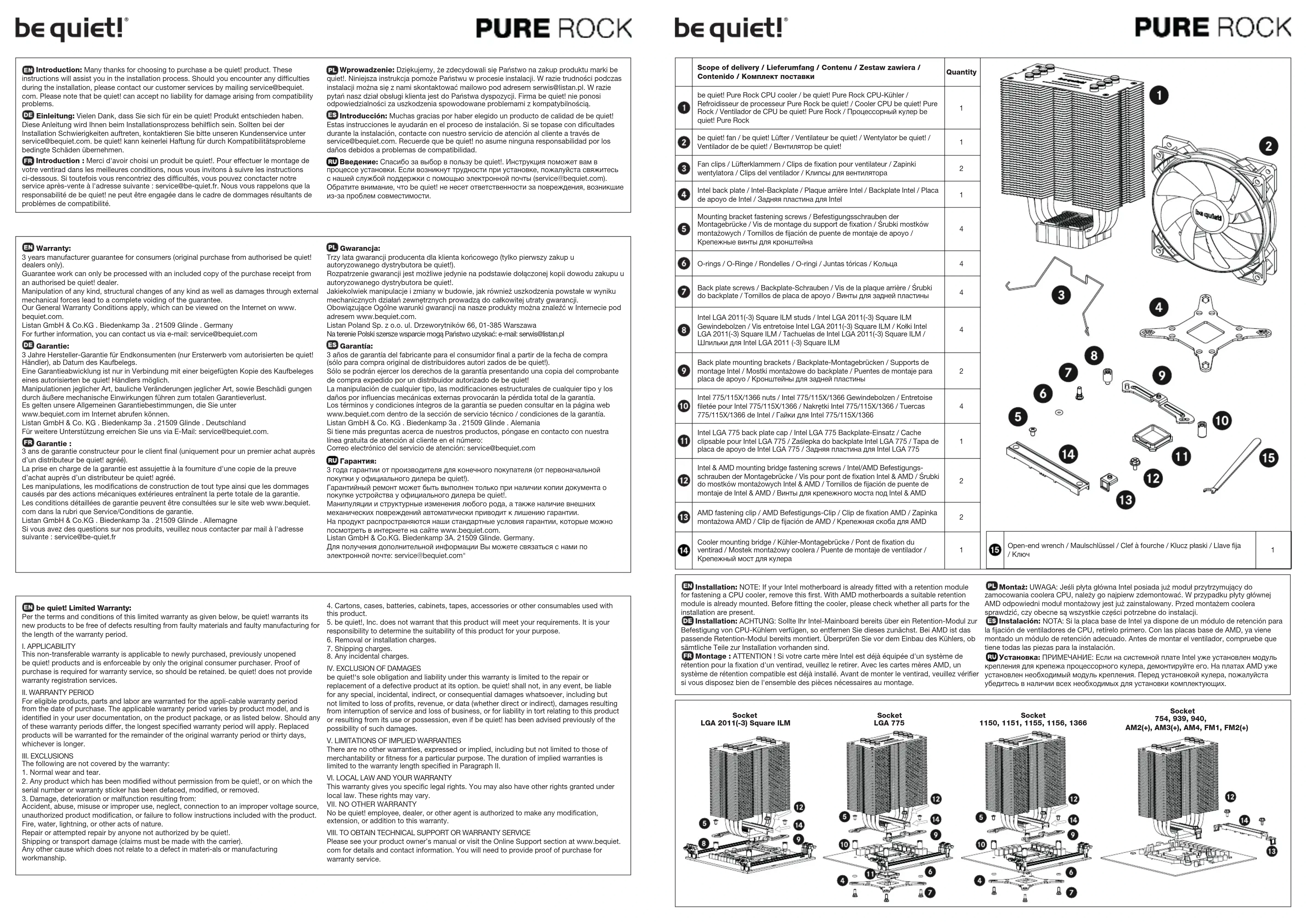 FR Introduction : Merci d'avoir choisi un produit be quiet!. Pour effectuer le montage de votre ventirad dans les meilleures conditions, nous vous invitons à suivre les instructions ci-dessous. Si toutefois vous rencontrez des difficultés, vous pouvez constacter notre service après-vente à l'adresse suivante : service@be-quiet.fr. Nous vous rappelons que la responsabilité de be quiet! ne peut être engagée dans le cadre de dommages résultants de problèmes de compatibilité.