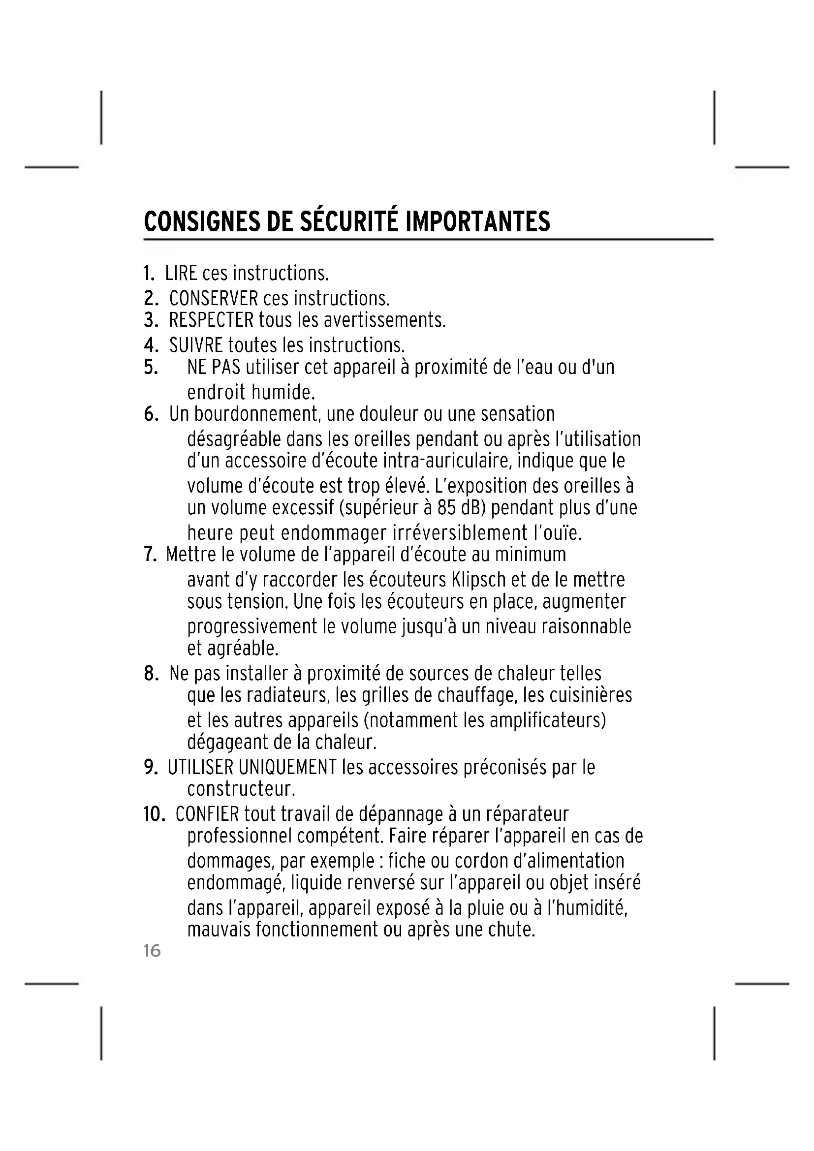 Sauf en cas d'urgence, Klipsch déconseille l'utilisation de ces écouteurs ou des casques (écouteurs plus microphone) en tant qu'équipement de communication d’aviation car ils ne sont pas adaptés à un grand nombre des conditions environnementales se produisant couramment dans le cas des avions commerciaux ou non-commerciaux (incluant mais sans s'y limiter : l'altitude, la température, les conditions de bruit, les vols sans pressurisation, etc.), qui risquent d’entraîner une interférence avec des communications cruciales. L’administration américaine d’hygiène et de sécurité du travail (OSHA) a publié des recommandations d’utilisation des écouteurs, définissant des niveaux maximaux d’exposition quotidienne et de pression acoustique (mesurée en décibels, dB). Le décibel est l’unité de mesure du son. Le nombre de décibels augmente exponentiellement avec l’intensité du son. Par exemple, le niveau d’une conversation est généralement d’environ 60 dB, et celui d’un concert de rock dans un stade est souvent d’environ 110 dB.18 Niveau de pression acoustique Durée d'exposition maximum recommandée par jour 90dB 8 Heures 92dB 6 Heures 95dB 4 Heures 97dB 3 Heures 100dB 2 Heures 102dB 1.5 Heures 105dB 1 Heures 110dB 30 Minutes 115dB 15 Minutes ou moins 120dB À éviter car risque de lésions auditives DIRECTIVES OSHA POUR LES LIMITES DE DURÉE D’EXPOSITION AU BRUIT19