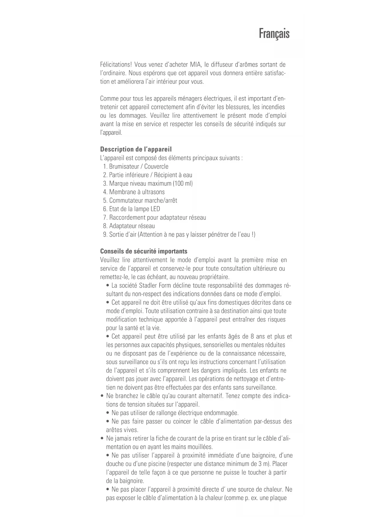 Retrouvez gratuitement la notice de l'appareil Mia STADLER FORM au format PDF.