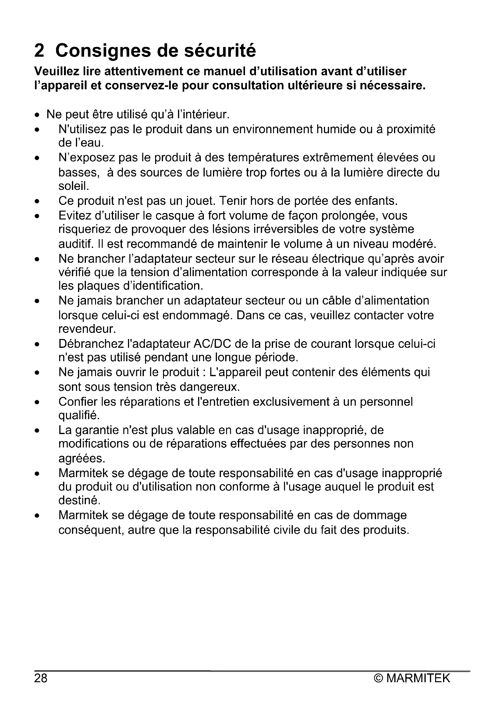 2 Consignes de sécurité Veuillez lire attentivement ce manuel d’utilisation avant d’utiliser l’appareil et conservez-le pour consultation ultérieure si nécessaire. x Ne peut être utilisé qu’à l’intérieur. x N'utilisez pas le produit dans un environnement humide ou à proximité de l’eau. x N’exposez pas le produit à des températures extrêmement élevées ou basses, à des sources de lumière trop fortes ou à la lumière directe du soleil. x Ce produit n'est pas un jouet. Tenir hors de portée des enfants. x Evitez d’utiliser le casque à fort volume de façon prolongée, vous risqueriez de provoquer des lésions irréversibles de votre système auditif. Il est recommandé de maintenir le volume à un niveau modéré. x Ne brancher l’adaptateur secteur sur le réseau électrique qu’après avoir vérifié que la tension d’alimentation corresponde à la valeur indiquée sur les plaques d’identification. x Ne jamais brancher un adaptateur secteur ou un câble d’alimentation lorsque celui-ci est endommagé. Dans ce cas, veuillez contacter votre revendeur. x Débranchez l'adaptateur AC/DC de la prise de courant lorsque celui-ci n'est pas utilisé pendant une longue période. x Ne jamais ouvrir le produit : L'appareil peut contenir des éléments qui sont sous tension très dangereux. x Confier les réparations et l'entretien exclusivement à un personnel qualifié. x La garantie n'est plus valable en cas d'usage inapproprié, de modifications ou de réparations effectuées par des personnes non agréées. x Marmitek se dégage de toute responsabilité en cas d'usage inapproprié du produit ou d'utilisation non conforme à l'usage auquel le produit est destiné. x Marmitek se dégage de toute responsabilité en cas de dommage conséquent, autre que la responsabilité civile du fait des produits.Surround Anywhere 221™