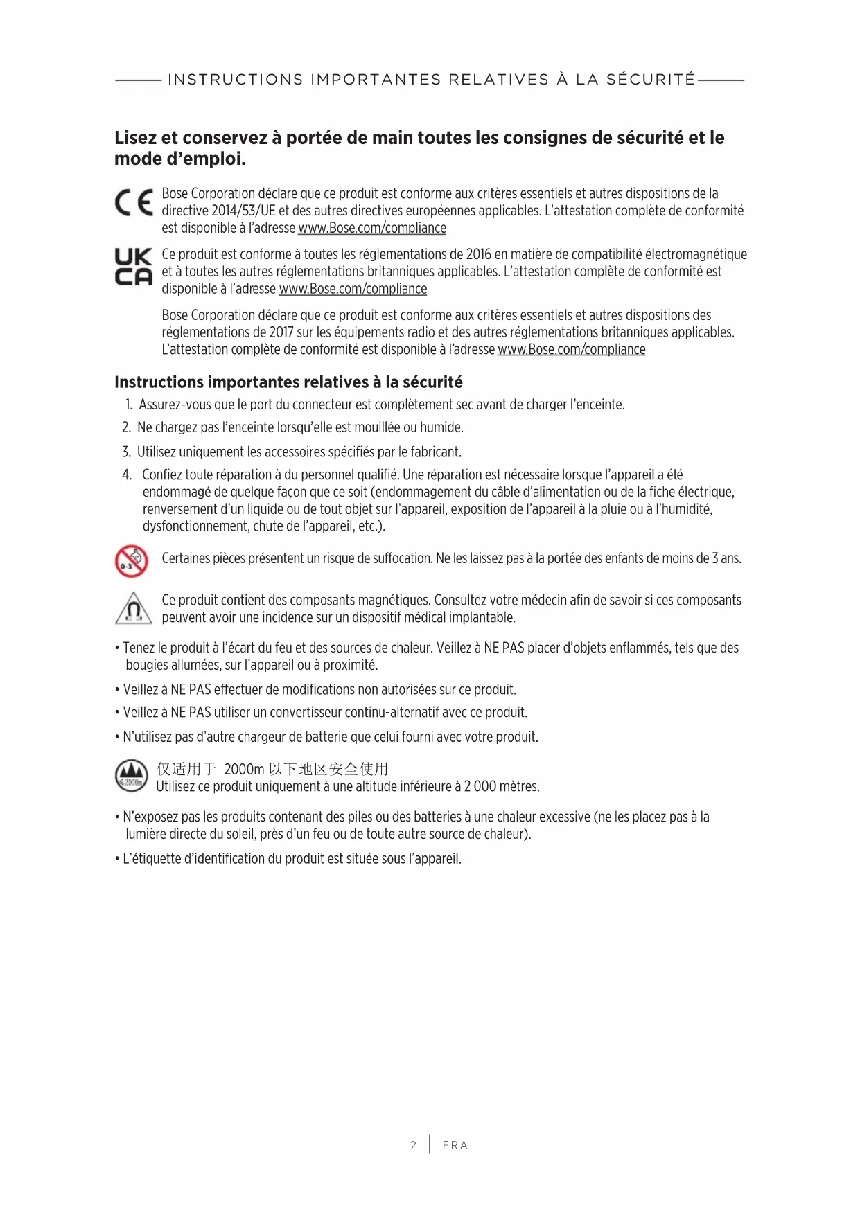 Bose Corporation déclare que ce produit est conforme aux critères essentiels et autres dispositions de la directive 2014/53/UE et des autres directives européennes applicables. L'attestation complète de conformité est disponible à l'adresse www.Bose.com/compliance