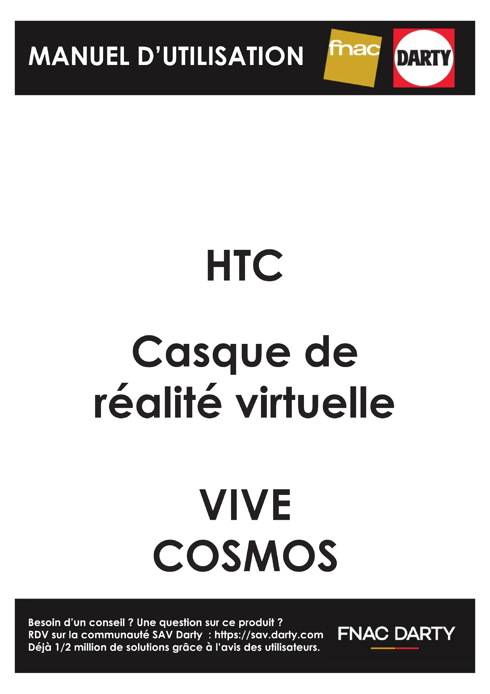 Besoin d’un conseil ? Une question sur ce produit ? RDV sur la communauté SAV Darty : https://sav.darty.com Déjà 1/2 million de solutions grâce à l’avis des utilisateurs. HTC Casque de réalité virtuelle VIVE COSMOS MANUEL D’UTILISATIONGuide de l’utilisateur du VIVE CosmosContenu Configuration requise Que contient la boîte ? 5 Quelle est la configuration système ? 5 Casque et écouteurs Casque 7 Écouteurs 27 Soin et maintenance du produit 40 Solutions communes 47 Boîtier de liaison À propos du boîtier de liaison pour le VIVE Cosmos 49 Connecter le casque à votre ordinateur via le boîtier de liaison 50 Redémarrer le boîtier de liaison 51 Puis-je utiliser d’anciennes versions du boîtier de liaison avec le VIVE Cosmos ? 52 Puis-je utiliser mon ordinateur portable avec VIVE Cosmos ? 52 Mon PC et mon casque sont allumés, mais pourquoi ne puis-je rien voir ? 52 Convertisseur À propos du convertisseur pour le VIVE Cosmos 53 Connecter le casque à votre ordinateur via le convertisseur 54 Redémarrer le convertisseur 55 Puis-je utiliser un ordinateur portable avec VIVE Cosmos ? 55 Mon casque et mon PC sont allumés, mais pourquoi ne puis-je rien voir ? 55 Contrôleurs À propos des contrôleurs VIVE Cosmos 56 Insérer les piles dans le contrôleur 58 Retirer s piles du contrôleur 59 Fixer les lanières aux contrôleurs 60 Allumer et éteindre les contrôleurs 60 Associer les contrôleurs avec le casque 61 Vérifier le niveau des piles des contrôleurs 61 Espace de jeux Qu'est-ce que l'espace de jeu ? 62 Planifier l'espace de jeu 62 Choisir l’espace de jeux 63 Configurer le VIVE Cosmos pour la première fois 64 Mettre en place l'espace de jeux 65 Quel est l’espace recommandé pour l’espace de jeu ? 66 Puis-je inclure un espace occupé par des meubles pour l’espace de jeu ? 66 Est-ce que VIVE Cosmos stocke l’image de ma pièce ou de mon environnement ? 66 Les expériences stationnaires peuvent-elles fonctionner au niveau d’une pièce ? 66 Comment puis-je corriger les erreurs de téléchargement lors de l’installation de la Configuration VIVE ? 66 2 ContenuJe ne peux pas terminer la configuration de la pièce. Que dois-je faire ? 66 Pourquoi le casque et les contrôleurs ne sont-ils pas correctement suivis ? 67 Système de réalité VIVE Qu’est-ce que Système de réalité VIVE ? 69 Qu’est-ce que Lens ? 69 Qu’est-ce que Origin ? 71 Paramètres Désactiver la limite de volume 73 Prendre des captures d'écran en VR 73 Voir l’environnement réel 74 Activer la compensation de mouvement 74 Qu'est-ce que la compensation de mouvement ? 75 Mise à jour du microprogramme 75 Dépannage de VIVE Cosmos 76 Rejoindre le programme bêta de VIVE Cosmos 76 Définir la fréquence d’alimentation 76 Que signifient les codes d'erreur et les messages ? Que puis-je faire ? 77 Marques commerciales et droits d’auteur Index 3 ContenuÀ propos de ce guide Les symboles suivants sont utilisés pour indiquer des informations importantes et utiles : Ceci est une note. Elle fournit des informations détaillées sur la configuration, les questions fréquentes et les procédures à suivre dans des situations spécifiques. Ceci est un conseil. Il vous donnera une solution alternative pour une étape ou une procédure particulière que vous pouvez trouver utile. Ceci indique des informations importantes nécessaires pour d'accomplir une certaine tâche ou pour que votre appareil fonctionne correctement. Ceci est un avertissement. Prenez en note pour éviter les problèmes potentiels ou pour éviter d'endommager votre matériel. Les informations contenues dans ce guide peuvent avoir changé. Pour obtenir les informations les plus récentes, notamment la dernière version de ce guide, allez à l'Assistance VIVE. Avant d'utiliser le produit, lisez attentivement les informations de sécurité de VIVE et suivez toutes les instructions de sécurité et d'utilisation du produit sur https://www.vive.com/legal/. 4 À propos de ce guideConfiguration requise Que contient la boîte ? Votre VIVE Cosmos est livré avec les éléments suivants, que vous utiliserez pour faire l'expérience des environnements VR immersifs : Composant principal Accessoires VIVE Cosmos § Câble du casque (installé) § Câble audio (installé) § Sangle supérieure (installée) § Cadre des coussins du visage avec coussins (installé) § Chiffon de nettoyage § Écouteurs supra (installé) Pour utiliser vos propres écouteurs avec VIVE Cosmos, vous aurez besoin du kit de remplacement pour écouteurs. Pour des détails sur comment obtenir le kit, contactez le Service client. Boîtier de liaison ou convertisseur § Adaptateur secteur § Câble DisplayPort