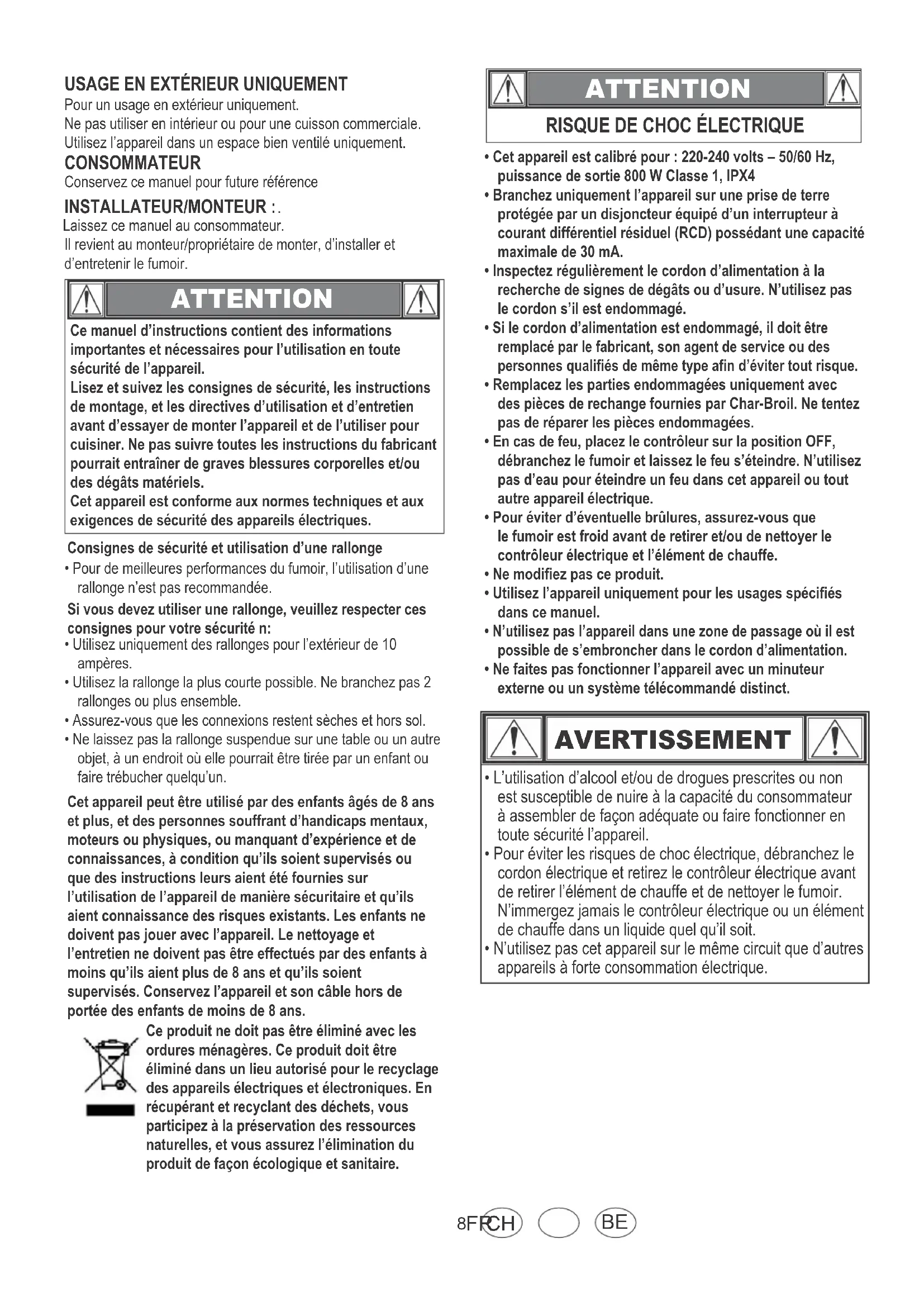 ATTENTION INSTALLATEUR/MONTEUR : Laissez ce manuel au consommateur.Il revient au monteur/propriétaire de monter, d’installer et d’entretenir le fumoir.Pour un usage en extérieur uniquement.Ne pas utiliser en intérieur ou pour une cuisson commerciale.Utilisez l’appareil dans un espace bien ventilé uniquement.Ce manuel d’instructions contient des informations importantes et nécessaires pour l’utilisation en toute sécurité de l’appareil.Lisez et suivez les consignes de sécurité, les instructions de montage, et les directives d’utilisation et d’entretien avant d’essayer de monter l’appareil et de l’utiliser pour cuisiner. Ne pas suivre toutes les instructions du fabricant pourrait entraîner de graves blessures corporelles et/ou des dégâts matériels.Cet appareil est conforme aux normes techniques et aux exigences de sécurité des appareils électriques.• Pour de meilleures performances du fumoir, l’utilisation d’unerallonge n’est pas recommandée.• Utilisez uniquement des rallonges pour l’extérieur de 10ampères.• Utilisez la rallonge la plus courte possible. Ne branchez pas 2rallonges ou plus ensemble.• Assurez-vous que les connexions restent sèches et hors sol.• Ne laissez pas la rallonge suspendue sur une table ou un autreobjet, à un endroit où elle pourrait être tirée par un enfant ou faire trébucher quelqu’un.