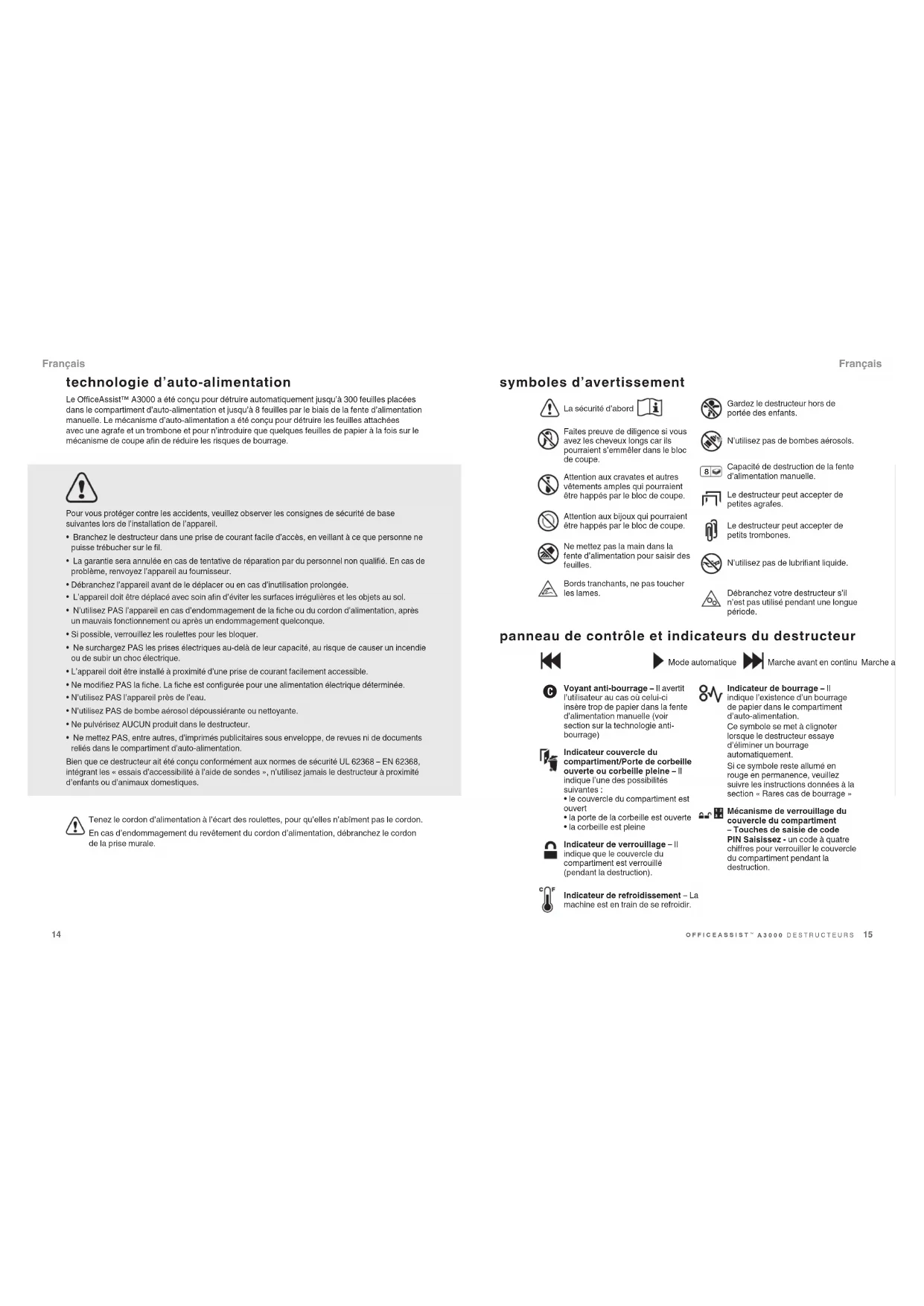 Le Office AssistTM A3000 a été écou pour détruire automatiquement jusqu'à 300 feuées placées dans le compartment d'auto-alimentation et jusqu'à 8 feuilles par le bian de la fente d'alimentation manuelle. Le mécanisme d'auto-alimentation a été écou pour détruire les feuées attachées avec une agrafe et un trombone et pour n'introduire que quelques feuées de papier à la fois sur le mécanisme de coupe afin de réduire les risques de bourrage.