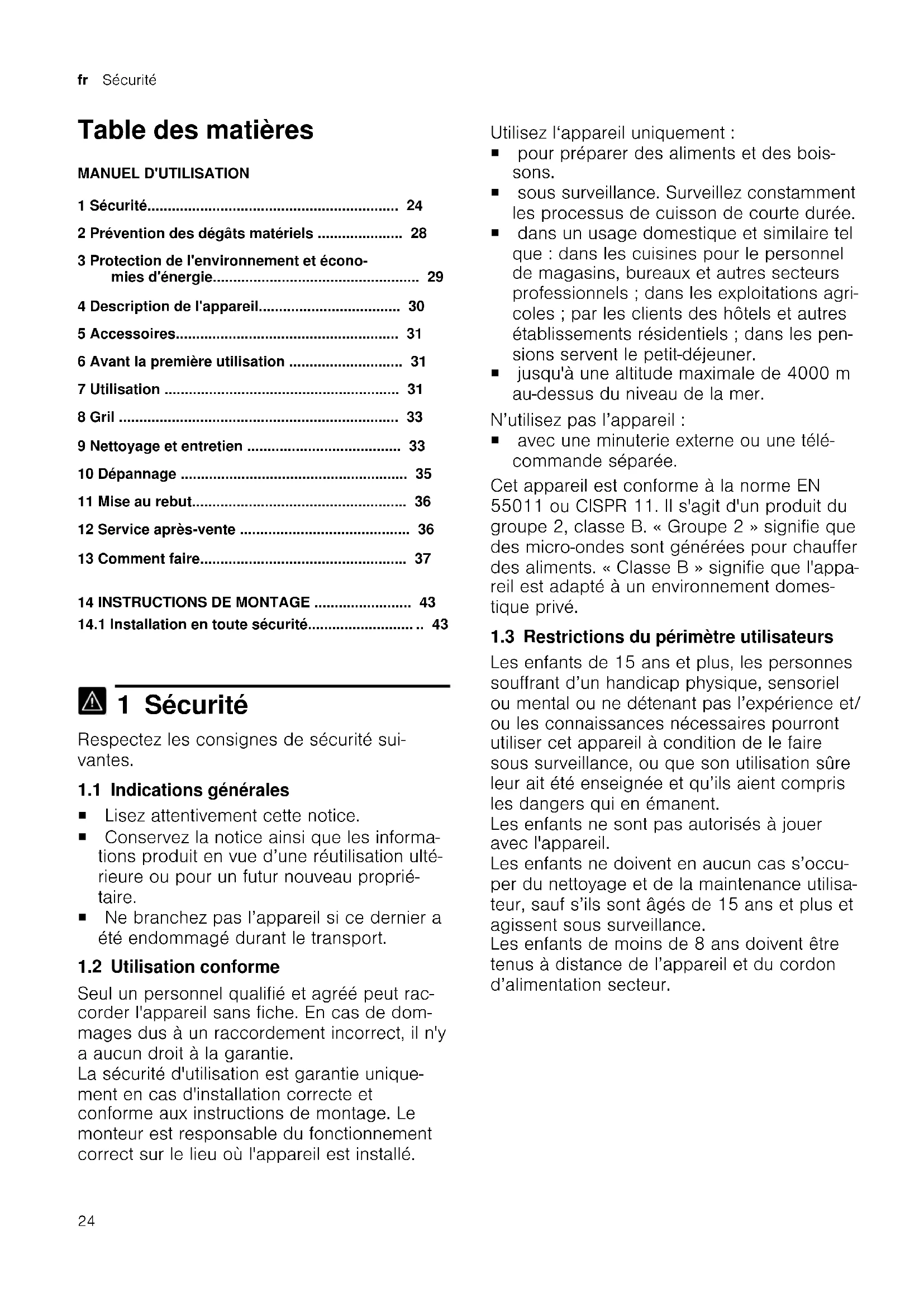 1 Sécurité Respectez les consignes de sécurité sui- vantes. 1.1 Indications générales ¡ Lisez attentivement cette notice. ¡ Conservez la notice ainsi que les informa- tions produit en vue d’une réutilisation ulté- rieure ou pour un futur nouveau proprié- taire. ¡ Ne branchez pas l’appareil si ce dernier a été endommagé durant le transport. 1.2 Utilisation conforme Seul un personnel qualifié et agréé peut rac- corder l'appareil sans fiche. En cas de dom- mages dus à un raccordement incorrect, il n'y a aucun droit à la garantie. La sécurité d'utilisation est garantie unique- ment en cas d'installation correcte et conforme aux instructions de montage. Le monteur est responsable du fonctionnement correct sur le lieu où l'appareil est installé. Utilisez l‘appareil uniquement: ¡ pour préparer des aliments et des bois- sons. ¡ sous surveillance. Surveillez constamment les processus de cuisson de courte durée. ¡ dans un usage domestique et similaire tel que: dans les cuisines pour le personnel de magasins, bureaux et autres secteurs professionnels; dans les exploitations agri- coles; par les clients des hôtels et autres établissements résidentiels; dans les pen- sions servent le petit-déjeuner. ¡ jusqu'à une altitude maximale de 4000m au-dessus du niveau de la mer. N’utilisez pas l’appareil: ¡ avec une minuterie externe ou une télé- commande séparée. Cet appareil est conforme à la norme EN 55011 ou CISPR 11. Il s'agit d'un produit du groupe 2, classe B. «Groupe 2» signifie que des micro-ondes sont générées pour chauffer des aliments. «Classe B» signifie que l'appa- reil est adapté à un environnement domes- tique privé. 1.3 Restrictions du périmètre utilisateurs Les enfants de 15 ans et plus, les personnes souffrant d’un handicap physique, sensoriel ou mental ou ne détenant pas l’expérience et/ ou les connaissances nécessaires pourront utiliser cet appareil à condition de le faire sous surveillance, ou que son utilisation sûre leur ait été enseignée et qu’ils aient compris les dangers qui en émanent. Les enfants ne sont pas autorisés à jouer avec l'appareil. Les enfants ne doivent en aucun cas s’occu- per du nettoyage et de la maintenance utilisa- teur, sauf s’ils sont âgés de 15ans et plus et agissent sous surveillance. Les enfants de moins de 8ans doivent être tenus à distance de l’appareil et du cordon d’alimentation secteur.Sécurité fr