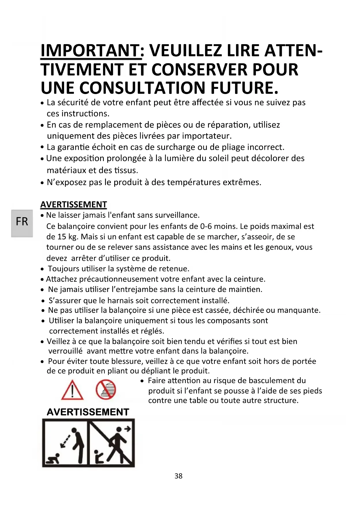 Faire attention au risque de basculement du produit si l'enfant se pousse à l'aide de ses pieds contre une table ou toute autre structure.