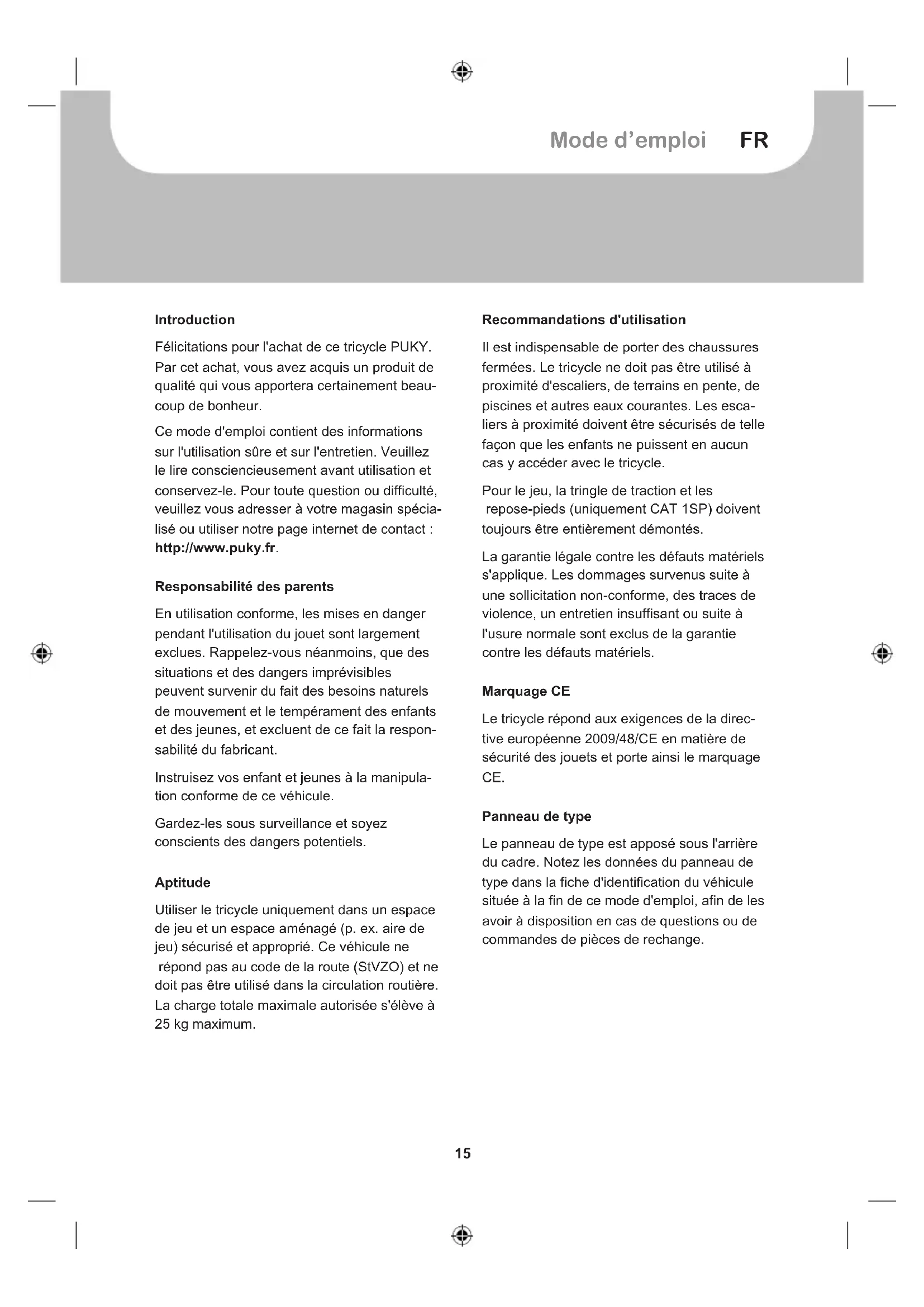 Felicitations pour l'achat de ce tricycle PUKY. Par cet achat, vous avez acquis un produit de qualite qui vous apportera certainement beau-coup de bonheur.