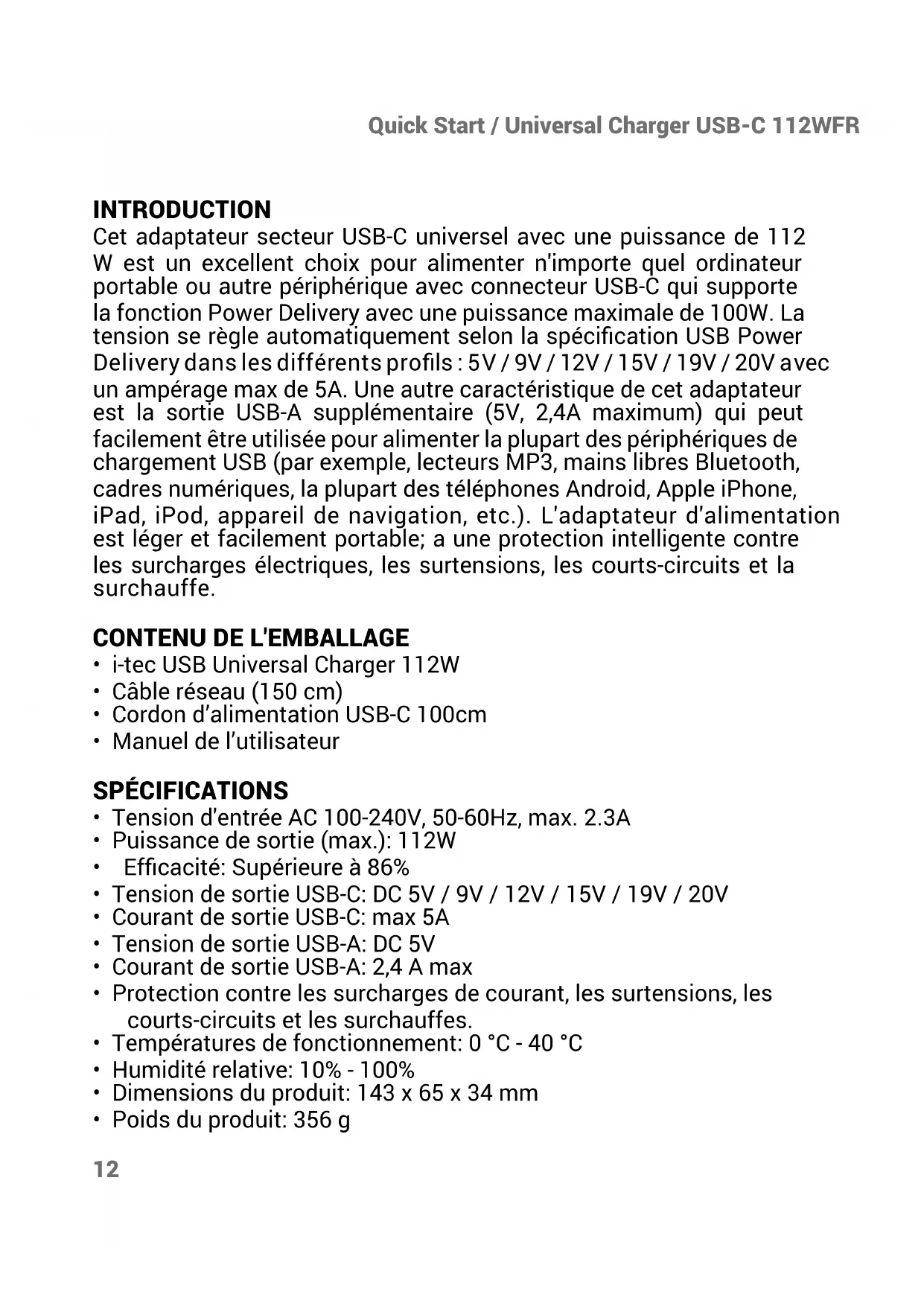 - Das Kabel ist beschädigt. HÄUFIG GESTELLTE FRAGEN – Verfügbar auf unserer Webseite www.i-tec.cz/de auf der Registerkarte “FAQ” dieses Produkts12 Quick Start / Universal Charger USB-C 112WFR INTRODUCTION Cet adaptateur secteur USB-C universel avec une puissance de 112 W est un excellent choix pour alimenter n'importe quel ordinateur portable ou autre périphérique avec connecteur USB-C qui supporte la fonction Power Delivery avec une puissance maximale de 100W. La tension se règle automatiquement selon la spécification USB Power Delivery dans les différents profils : 5V / 9V / 12V / 15V / 19V / 20V avec un ampérage max de 5A. Une autre caractéristique de cet adaptateur est la sortie USB-A supplémentaire (5V, 2,4A maximum) qui peut facilement être utilisée pour alimenter la plupart des périphériques de chargement USB (par exemple, lecteurs MP3, mains libres Bluetooth, cadres numériques, la plupart des téléphones Android, Apple iPhone, iPad, iPod, appareil de navigation, etc.). L'adaptateur d'alimentation est léger et facilement portable; a une protection intelligente contre les surcharges électriques, les surtensions, les courts-circuits et la surchauffe.