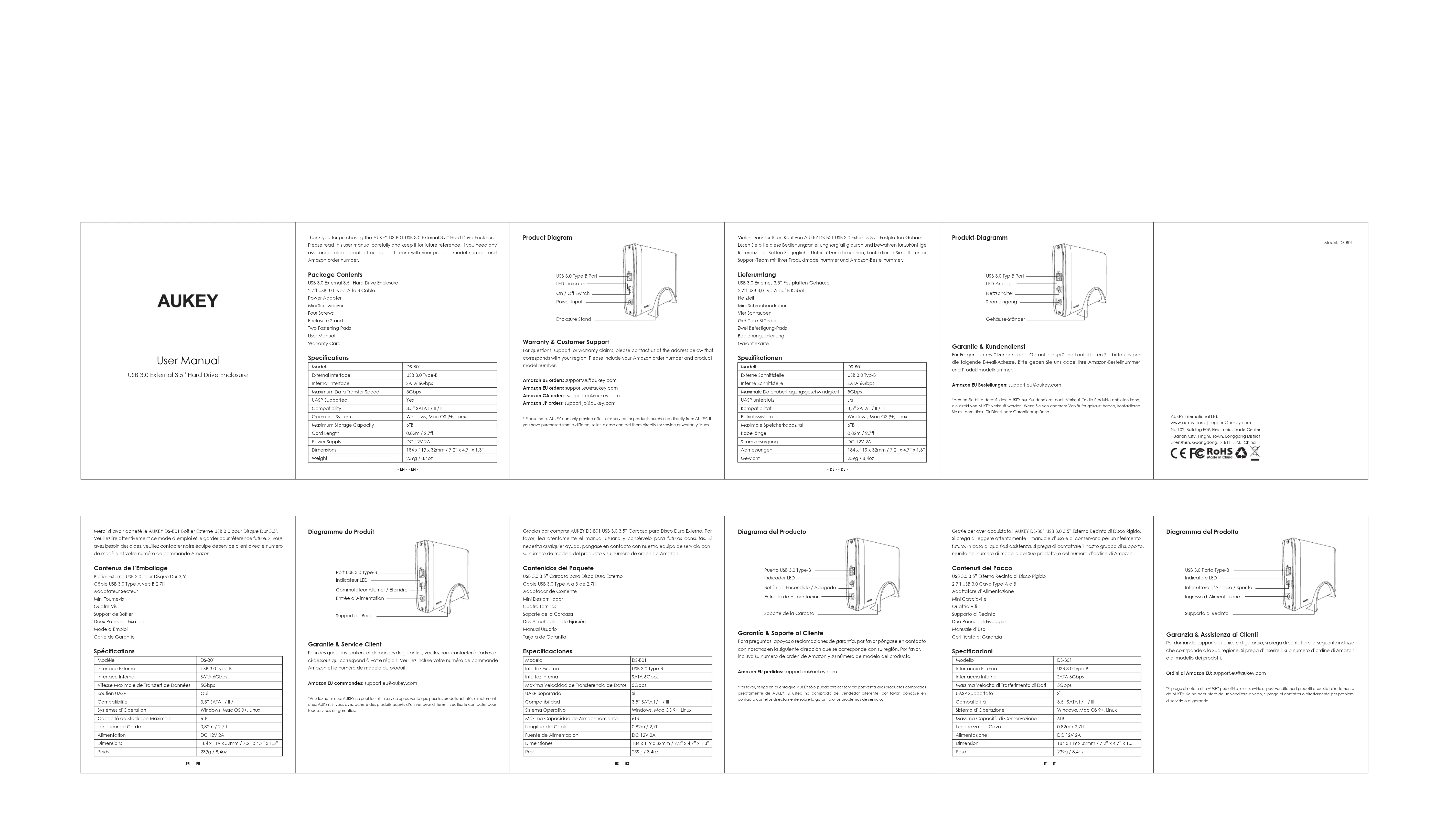 | Maintenance et réparation | Pas de maintenance nécessaire, en cas de dysfonctionnement, contacter le service client Aukey. |