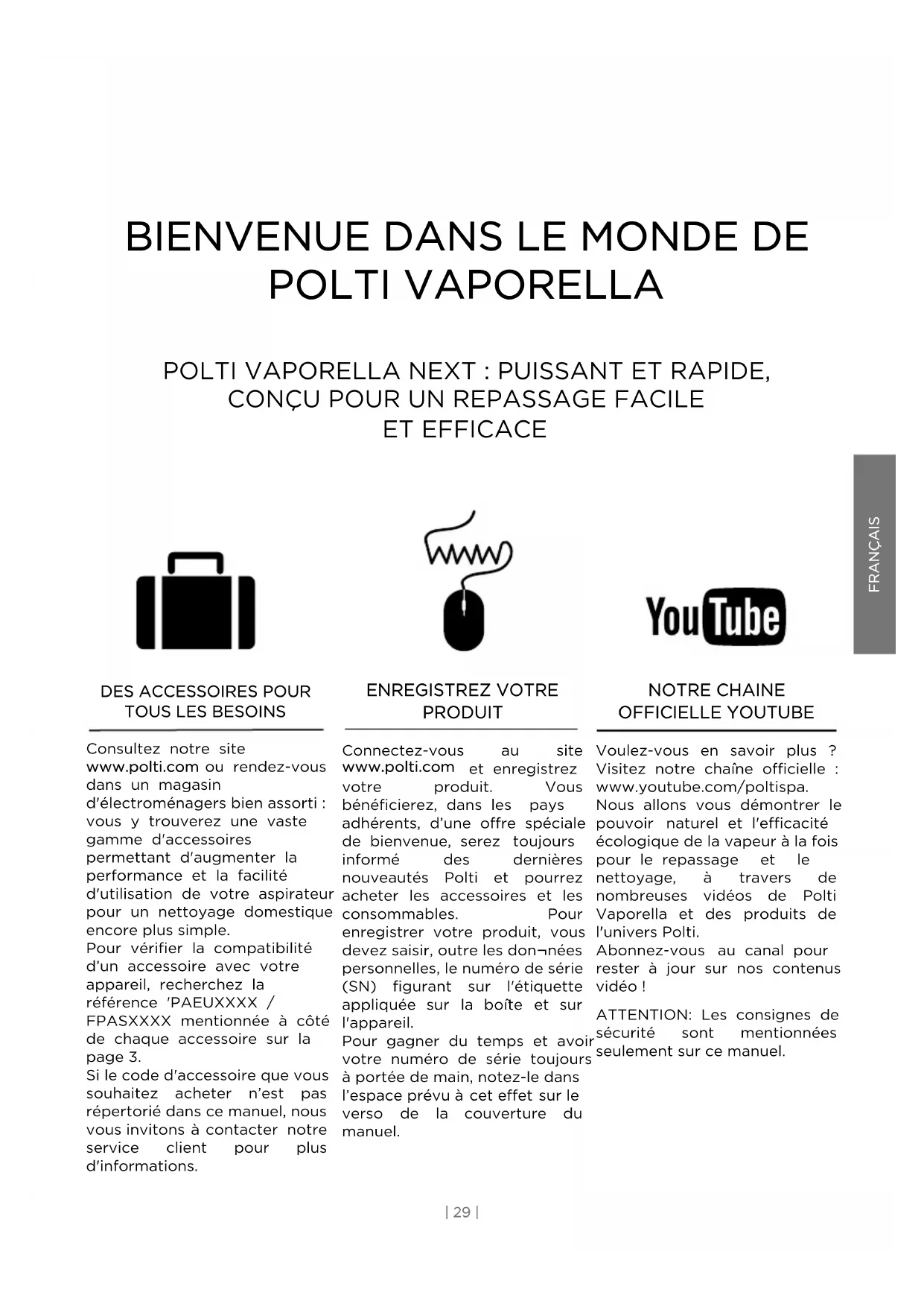 Consultez notre site www.polti.com ou rendez-vous dans un magasin d'électroménagers bien assorti : vous y trouverez une vaste gamme d'accessoires permettant d'augmenter la performance et la facilité d'utilisation de votre aspirateur pour un nettoyage domestique encore plus simple. Pour vérifier la compatibilité d’un accessoire avec votre appareil, recherchez la référence 'PAEUXXXX / FPASXXXX mentionnée à côté de chaque accessoire sur la page 3. Si le code d'accessoire que vous souhaitez acheter n’est pas répertorié dans ce manuel, nous vous invitons à contacter notre service client pour plus d'informations. ENREGISTREZ VOTRE PRODUIT Connectez-vous au site www.polti.com et enregistrez votre produit. Vous bénéficierez, dans les pays adhérents, d’une offre spéciale de bienvenue, serez toujours informé des dernières nouveautés Polti et pourrez acheter les accessoires et les consommables. Pour enregistrer votre produit, vous devez saisir, outre les don¬nées personnelles, le numéro de série (SN) figurant sur l'étiquette appliquée sur la boîte et sur l'appareil. Pour gagner du temps et avoir votre numéro de série toujours à portée de main, notez-le dans l’espace prévu à cet effet sur le verso de la couverture du manuel. NOTRE CHAINE OFFICIELLE YOUTUBE Voulez-vous en savoir plus ? Visitez notre chaîne officielle : www.youtube.com/poltispa. Nous allons vous démontrer le pouvoir naturel et l'efficacité écologique de la vapeur à la fois pour le repassage et le nettoyage, à travers de nombreuses vidéos de Polti Vaporella et des produits de l'univers Polti. Abonnez-vous au canal pour rester à jour sur nos contenus vidéo! ATTENTION: Les consignes de sécurité sont mentionnées seulement sur ce manuel.AVERTISSEMENTS EN MATIÈRE DE SÉCURITÉ