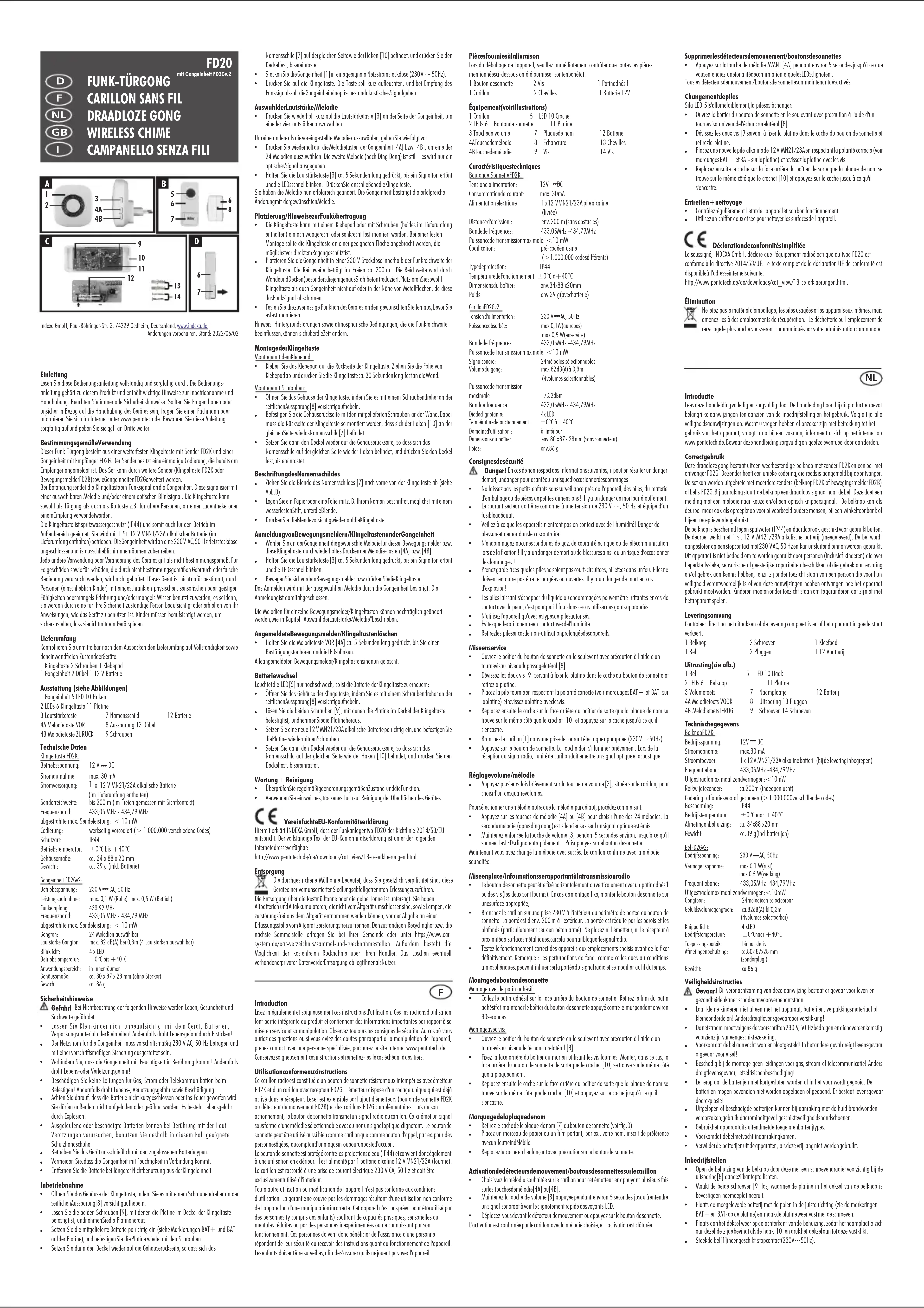 Ce casillon radié est constitué d'un bacón de sonnette réductant aux intermpômes avec émettrement FD2K et d'un bacón avec récepteur FD2K. L'émettrement dispose d'une codage unique qui est déjà activée dans le récepteur. Le selat est extensible par l'ajout d'émettiments (boutende de sommétique FD2K ou dépréciateur de mouvement FD2B) et des cions FD2K complètemplantes. Les de son actionement, le bacón de sommétique transmit un signal radio au cordon. Ce–é meté un signal sous forme d'une méniolactique的选择或者 avec non un signal optique clignanti. Le bacdon de sommétique peut être utilisée aussi bien comme sommétique comme boumenton d'opel, par ex, pour des personnesagées, uacompôtroid unmanagain ouxpourimpecté/accouel. Le bacdon de sommétique est prolongé contre les projections équées (IP44) et convient doné également à une utilisation en extérieur. Il est alimentée par 1 batterie calcinée 12 V M21/23A (fournis). Le bacdon est rattaché à une多位 de courant électrique 230 V CA, 50 Hz et doit être exclusivementutilité d'intérieur.