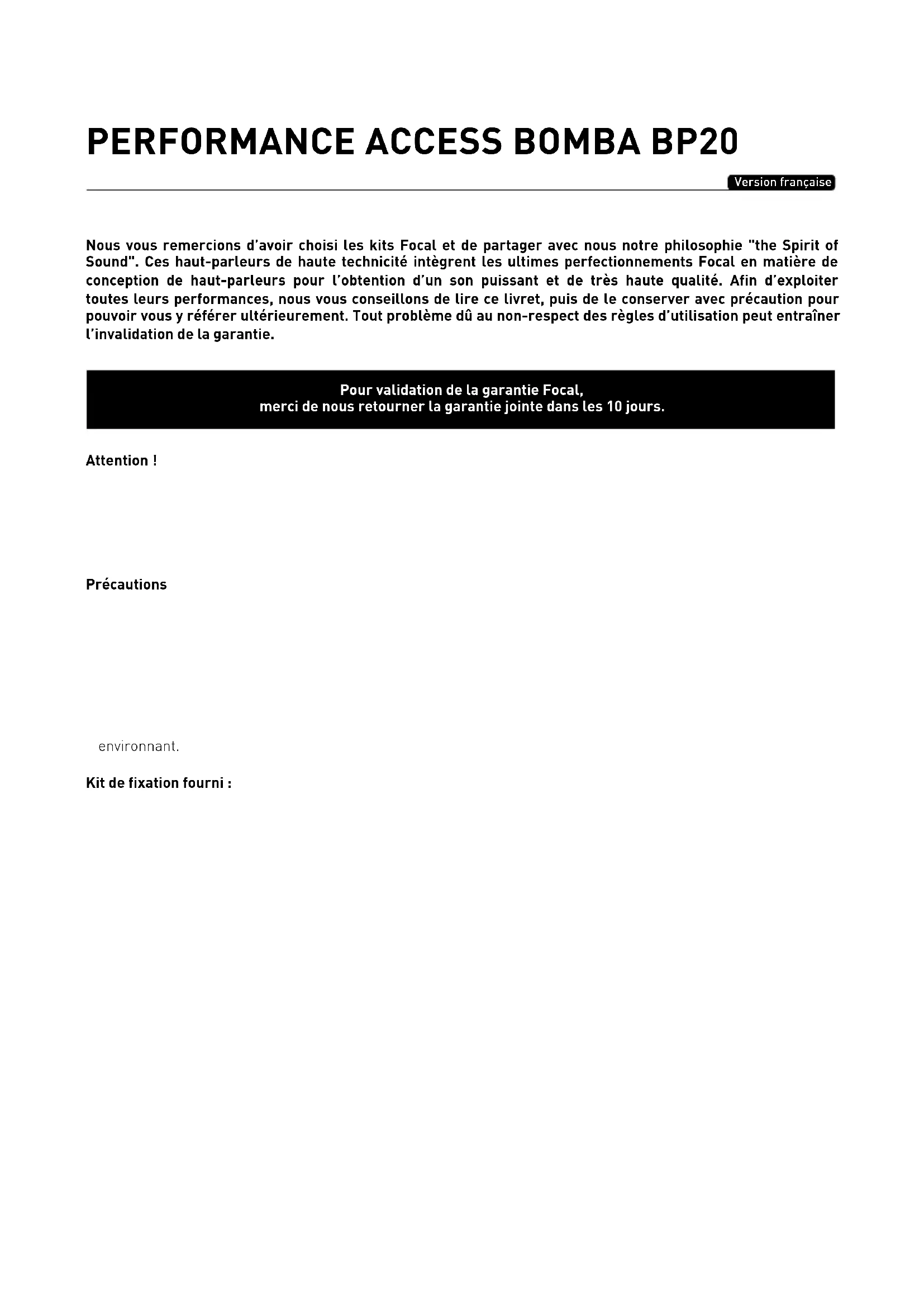 Manuel d'utilisation Pour validation de la garantie Focal, merci de nous retourner la garantie jointe dans les 10 jours.PERFORMANCE ACCESS BOMBA BP20 Manuel d'installation