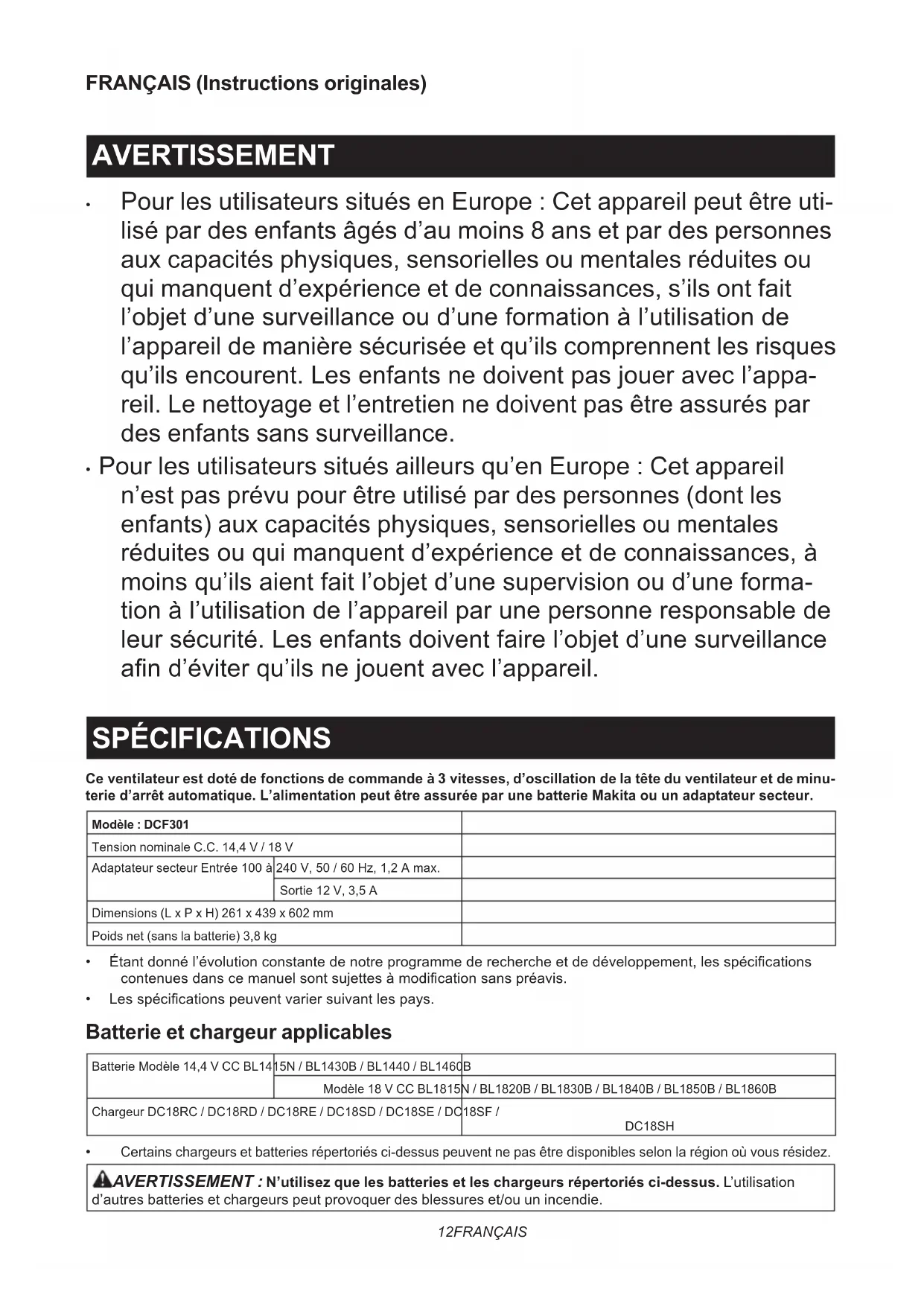 - Pour les utilisateurs situés ailleurs qu’en Europe : Cet appareil n’est pas prévu pour être utilisé par des personnes (dont les enfants) aux capacités physiques, sensorielles ou mentales réduitesouquimanquentd’expérienceetdeconnaissances,à moinsqu’ilsaientfaitl’objetd’unesupervisionoud’uneforma- tionàl’utilisationdel’appareilparunepersonneresponsablede leursécurité.Lesenfantsdoiventfairel’objetd’unesurveillance and’éviterqu’ilsnejouentavecl’appareil. SPÉCIFICATIONS Ce ventilateur est doté de fonctions de commande à 3 vitesses, d’oscillation de la tête du ventilateur et de minu- terie d’arrêt automatique. L’alimentation peut être assurée par une batterie Makita ou un adaptateur secteur. Modèle : DCF301Tension nominale C.C. 14,4 V / 18 VAdaptateur secteur Entrée 100à240V,50/60Hz,1,2Amax.Sortie 12 V, 3,5 ADimensions (L x P x H) 261 x 439 x 602 mmPoids net (sans la batterie) 3,8 kg
