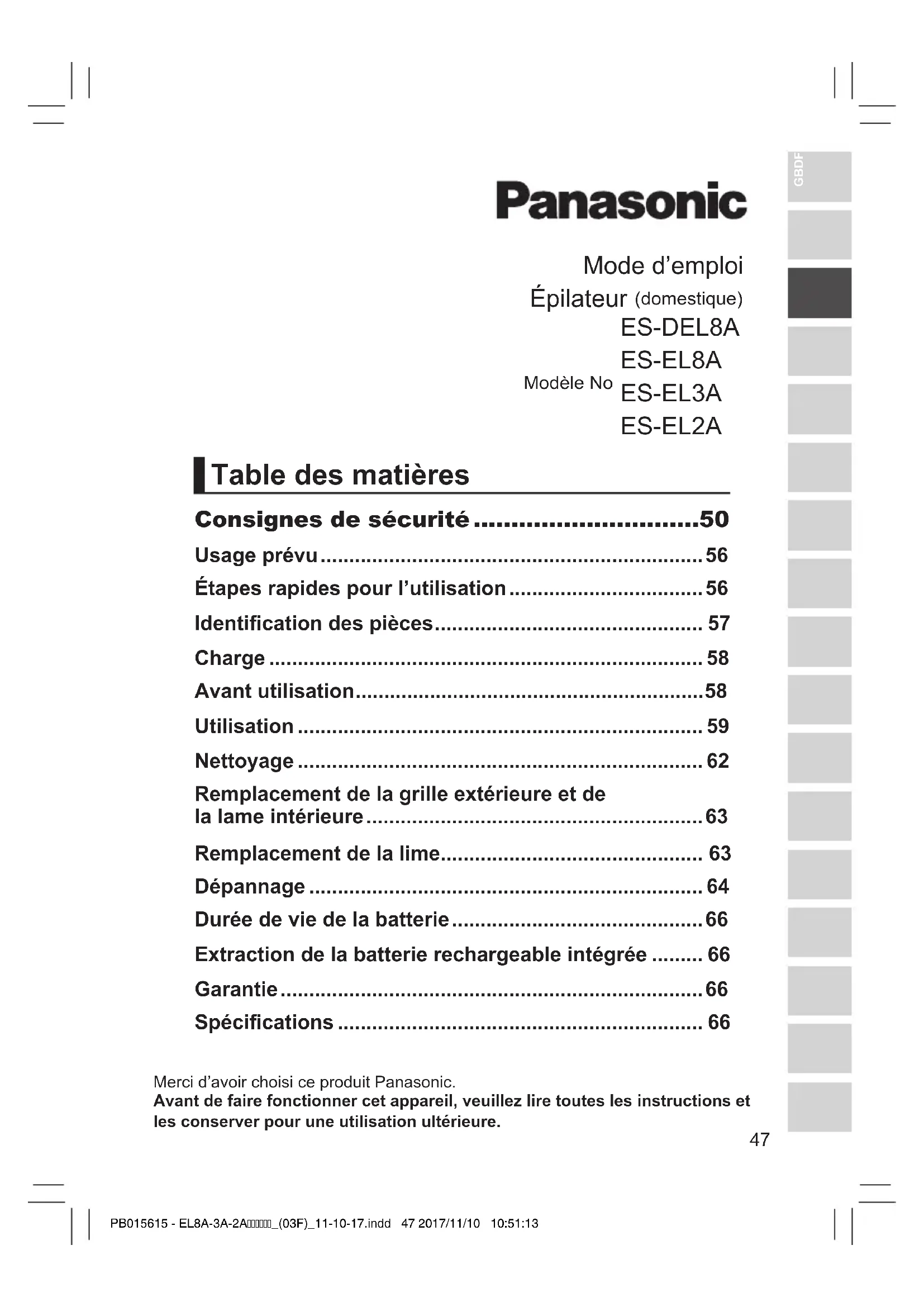 ESDEL8A - Epilateur PANASONIC - Notice d'utilisation et mode d'emploi gratuit