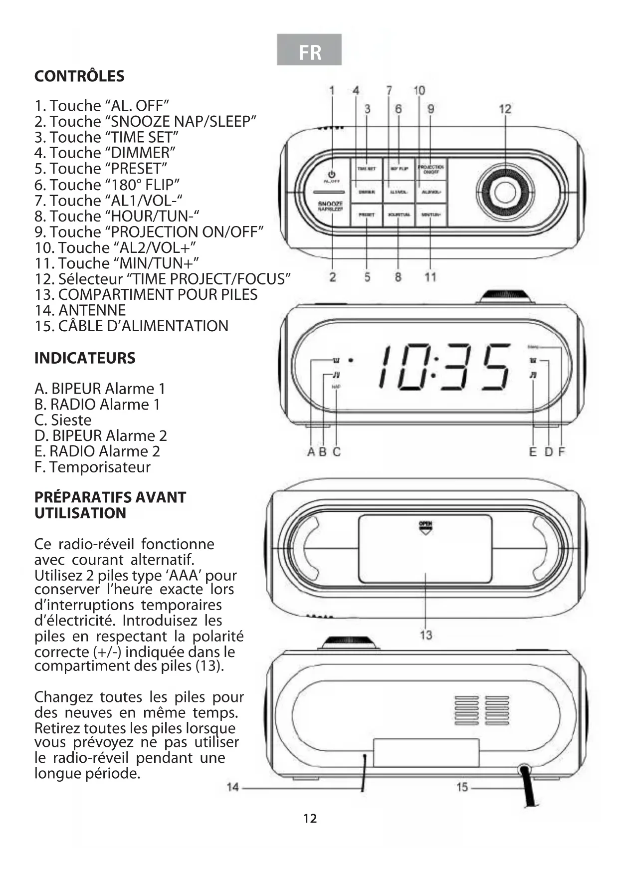 UTILISATION Ce radio-réveil fonctionne avec courant alternatif. Utilisez 2 piles type ‘AAA’ pour conserver l’heure exacte lors d’interruptions temporaires d’électricité. Introduisez les piles en respectant la polarité correcte (+/-) indiquée dans le compartiment des piles (13). Changez toutes les piles pour des neuves en même temps. Retirez toutes les piles lorsque vous prévoyez ne pas utiliser le radio-réveil pendant une longue période.FR