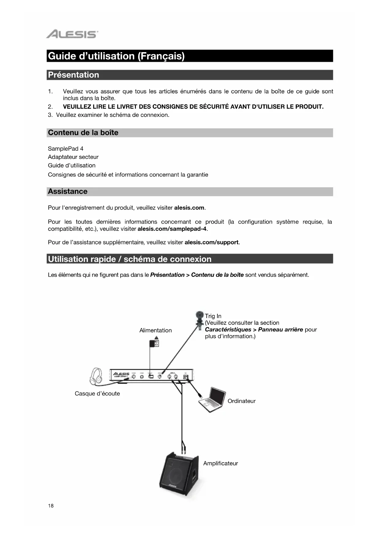Contenu de la boîte SamplePad 4 Adaptateur secteur Guide d’utilisation Consignes de sécurité et informations concernant la garantie Assistance Pour l'enregistrement du produit, veuillez visiter alesis.com. Pour les toutes dernières informations concernant ce produit (la configuration système requise, la compatibilité, etc.), veuillez visiter alesis.com/samplepad-4. Pour de l’assistance supplémentaire, veuillez visiter alesis.com/support. Utilisation rapide / schéma de connexion Les éléments qui ne figurent pas dans le Présentation > Contenu de la boîte sont vendus séparément.