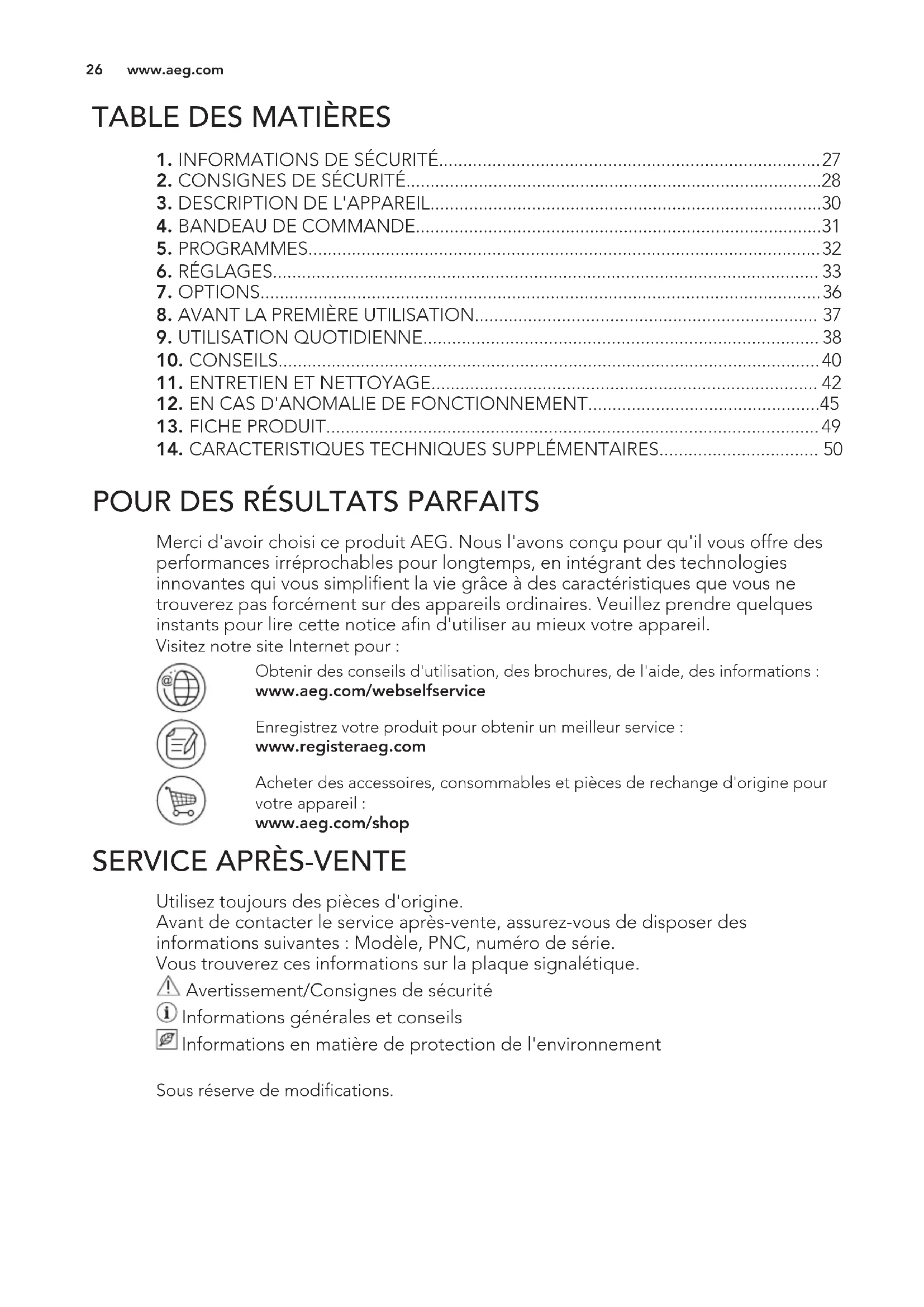 Merci d'avoir choisi ce produit AEG. Nous l'avons conçu pour qu'il vous offre des performances irréprochables pour longtemps, en intégrant des technologies innovantes qui vous simplifient la vie grâce à des caractéristiques que vous ne trouverez pas forcément sur des appareils ordinaires. Veuillez prendre quelques instants pour lire cette notice afin d'utiliser au mieux votre appareil. Visitez notre site Internet pour : Obtenir des conseils d'utilisation, des brochures, de l'aide, des informations : www.aeg.com/webselfservice Enregistrez votre produit pour obtenir un meilleur service : www.registeraeg.com Acheter des accessoires, consommables et pièces de rechange d'origine pour votre appareil : www.aeg.com/shop