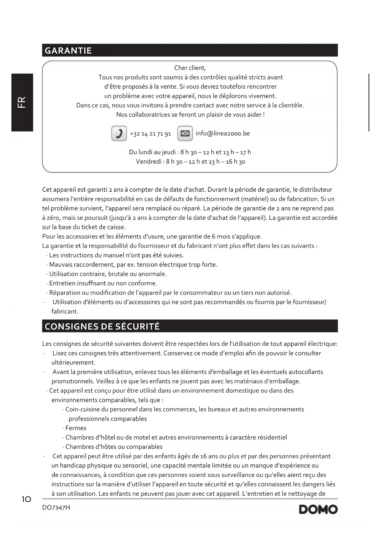 GARANTIE Cher client, Tous nos produits sont soumis à des contrôles qualité stricts avant d’être proposés à la vente. Si vous deviez toutefois rencontrer un problème avec votre appareil, nous le déplorons vivement. Dans ce cas, nous vous invitons à prendre contact avec notre service à la clientèle. Nos collaboratrices se feront un plaisir de vous aider ! +32 14 21 71 91 info@linea2000.be Du lundi au jeudi : 8 h 30 – 12 h et 13 h – 17 h Vendredi : 8 h 30 – 12 h et 13 h – 16 h 30 Cet appareil est garanti 2 ans à compter de la date d’achat. Durant la période de garantie, le distributeur assumera l’entière responsabilité en cas de défauts de fonctionnement (matériel) ou de fabrication. Si un tel problème survient, l’appareil sera remplacé ou réparé. La période de garantie de 2 ans ne reprend pas à zéro, mais se poursuit (jusqu’à 2 ans à compter de la date d’achat de l’appareil). La garantie est accordée sur la base du ticket de caisse. Pour les accessoires et les éléments d’usure, une garantie de 6 mois s’applique. La garantie et la responsabilité du fournisseur et du fabricant n’ont plus eet dans les cas suivants :
