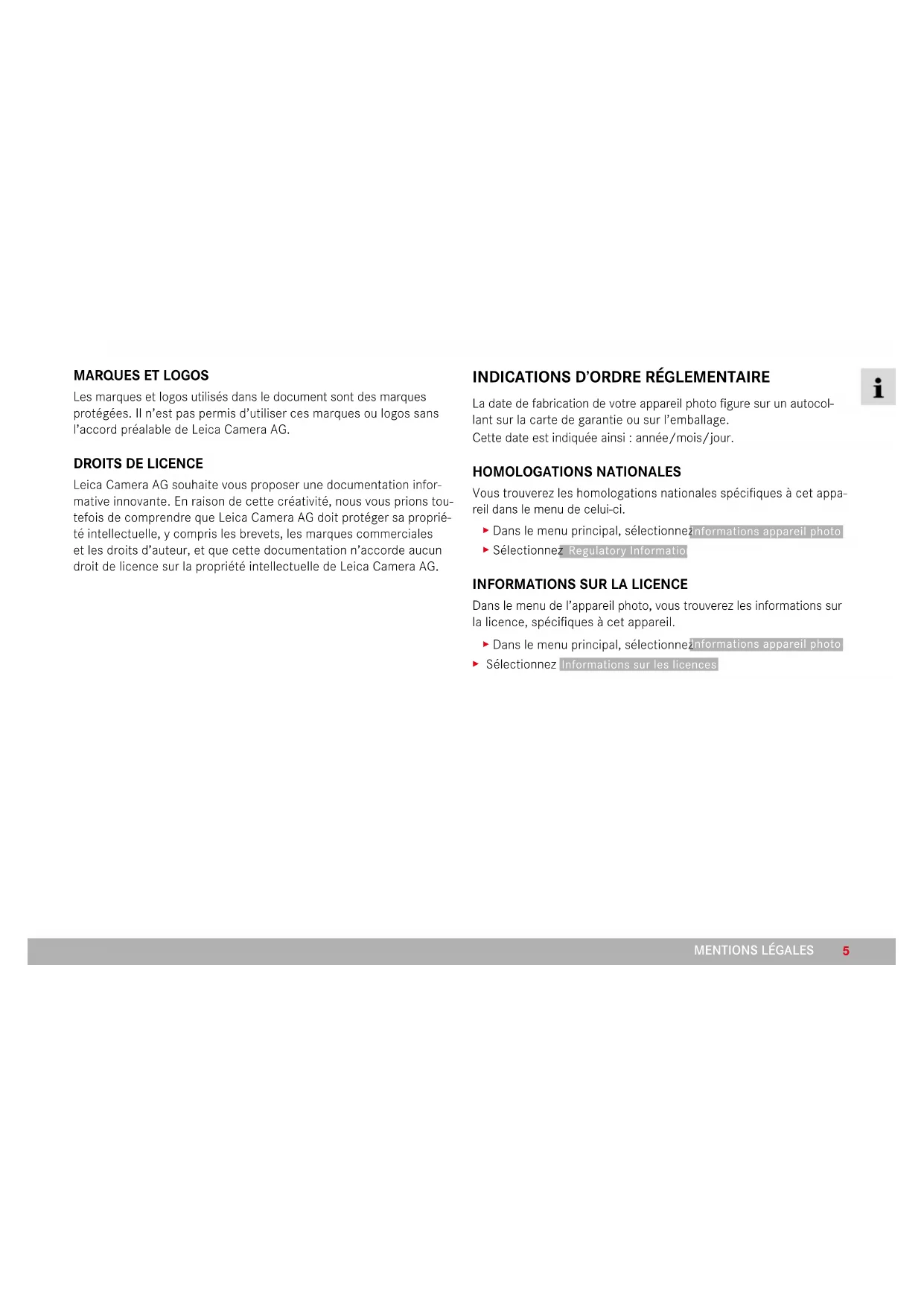 Leica Camera AG souhaite vous proposer une documentation infor- mative innovante. En raison de cette créativité, nous vous prions tou- tefois de comprendre que Leica Camera AG doit protéger sa proprié- té intellectuelle, y compris les brevets, les marques commerciales et les droits d’auteur, et que cette documentation n’accorde aucun droit de licence sur la propriété intellectuelle de Leica Camera AG.