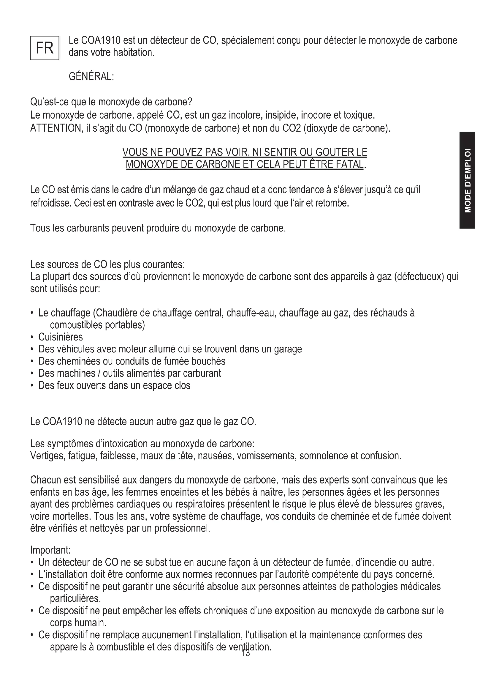 Le COA1910 est un détecteur de CO, spécialement conçu pour détecter le monoxyde de carbone dans votre habitation. GÉNÉRAL: Qu’est-ce que le monoxyde de carbone? Le monoxyde de carbone, appelé CO, est un gaz incolore, insipide, inodore et toxique. ATTENTION, il s’agit du CO (monoxyde de carbone) et non du CO2 (dioxyde de carbone). VOUS NE POUVEZ PAS VOIR, NI SENTIR OU GOUTER LE MONOXYDE DE CARBONE ET CELA PEUT ÊTRE FATAL. Le CO est émis dans le cadre d‘un mélange de gaz chaud et a donc tendance à s‘élever jusqu‘à ce qu‘il refroidisse. Ceci est en contraste avec le CO2, qui est plus lourd que l‘air et retombe. Tous les carburants peuvent produire du monoxyde de carbone. Les sources de CO les plus courantes: La plupart des sources d’où proviennent le monoxyde de carbone sont des appareils à gaz (défectueux) qui sont utilisés pour: