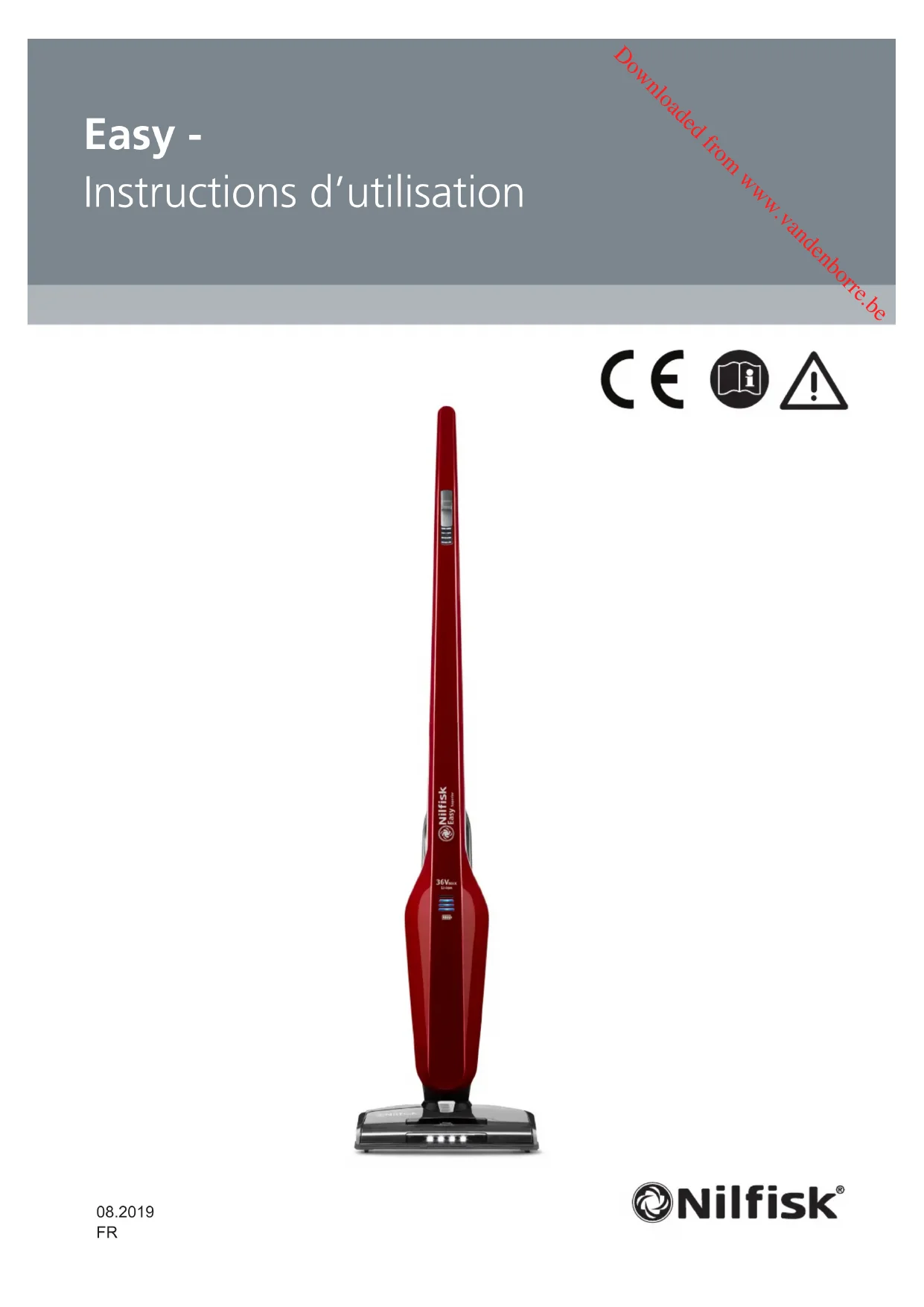 Easy - Instructions d’utilisation Downloaded from www.vandenborre.beInstructions d’utilisation2 Safety Instructions Avant d’utiliser la machine, lisez attentivement les instructions. Conservez les instructions pour consultation ultérieure. Il y a lieu de respecter les consignes de sécurité indiquées par ce symbole an de prévenir toute blessure aux personnes ou dégâts matériels graves. Utilisation prévue La machine a été conçue uniquement à des ns de nettoy age domestique. Toute autre utilisation est considérée comme non-conforme. Avertissements L’appareil peut être utilisé par des enfants de 8 ans et plus et par des personnes à capacités physiques, sensorielles ou mentales réduites, ou manquant d’expérience et de connaissances, s’ils ont été formés et sont surveillés dans l’utilisation de l’aspirateur en toute sécurité et s’ils comprennent les risques encourus. Les enfants ne doivent pas jouer avec l’appareil. Il ne faut pas coner le nettoyage et la maintenance « utilisateur » à des enfants sans surveillance. AVERTISSEMENT ! Utiliser uniquement l’alimentation électrique très basse tension fournie avec l’appareil . Cet appareil contient des batteries non remplaçables. Mise au rebut du produit Avant de mettre le produit au rebut, le bloc- batterie rechargeable doit être déposé et recyclé conformément aux lois fédérales et locales selon les modalités indiquées ci-dessous. AVER TIS SEMENT ! Il faut débrancher l´aspi- rateur de la station de charge et vider les batteries avant d’enlever le bloc-batterie.