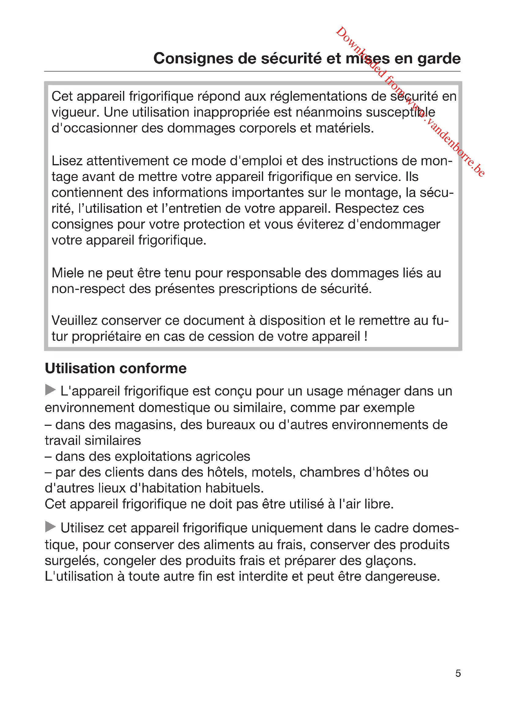 Cet appareil frigorifique répond aux réglementations de sécurité en vigueur. Une utilisation inappropriée est néanmoins susceptible d'occasionner des dommages corporels et matériels. Lisez attentivement ce mode d'emploi et des instructions de mon- tage avant de mettre votre appareil frigorifique en service. Ils contiennent des informations importantes sur le montage, la sécu- rité, l’utilisation et l’entretien de votre appareil. Respectez ces consignes pour votre protection et vous éviterez d'endommager votre appareil frigorifique. Miele ne peut être tenu pour responsable des dommages liés au non-respect des présentes prescriptions de sécurité. Veuillez conserver ce document à disposition et le remettre au fu- tur propriétaire en cas de cession de votre appareil! Utilisation conforme L'appareil frigorifique est conçu pour un usage ménager dans un environnement domestique ou similaire, comme par exemple – dans des magasins, des bureaux ou d'autres environnements de travail similaires – dans des exploitations agricoles – par des clients dans des hôtels, motels, chambres d'hôtes ou d'autres lieux d'habitation habituels. Cet appareil frigorifique ne doit pas être utilisé à l'air libre. Utilisez cet appareil frigorifique uniquement dans le cadre domes- tique, pour conserver des aliments au frais, conserver des produits surgelés, congeler des produits frais et préparer des glaçons. L'utilisation à toute autre fin est interdite et peut être dangereuse. Downloaded from www.vandenborre.beConsignes de sécurité et mises en garde