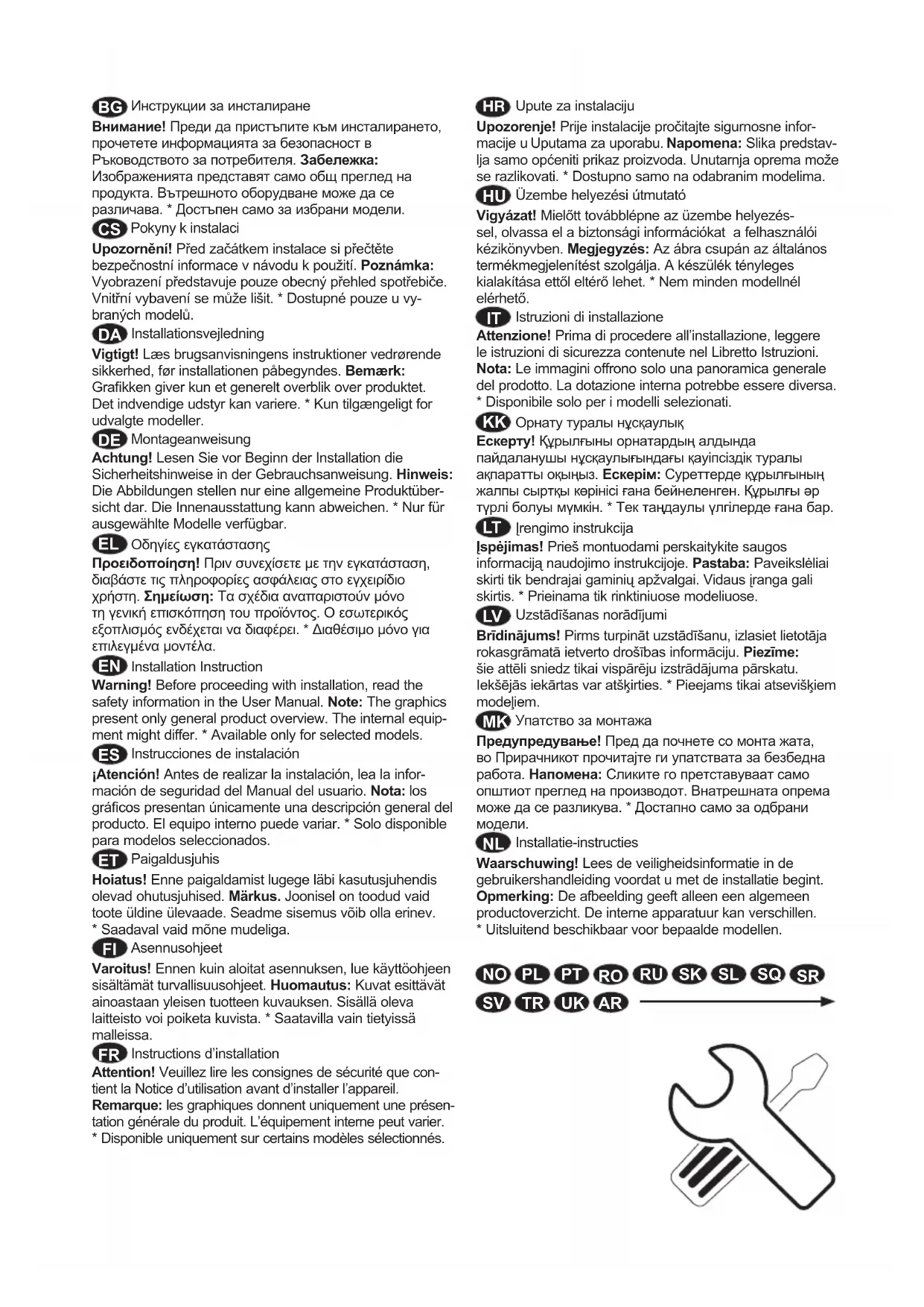 Instructions d’installation Attention! Veuillez lire les consignes de sécurité que con- tient la Notice d’utilisation avant d’installer l’appareil. Remarque: les graphiques donnent uniquement une présen- tation générale du produit. L’équipement interne peut varier.