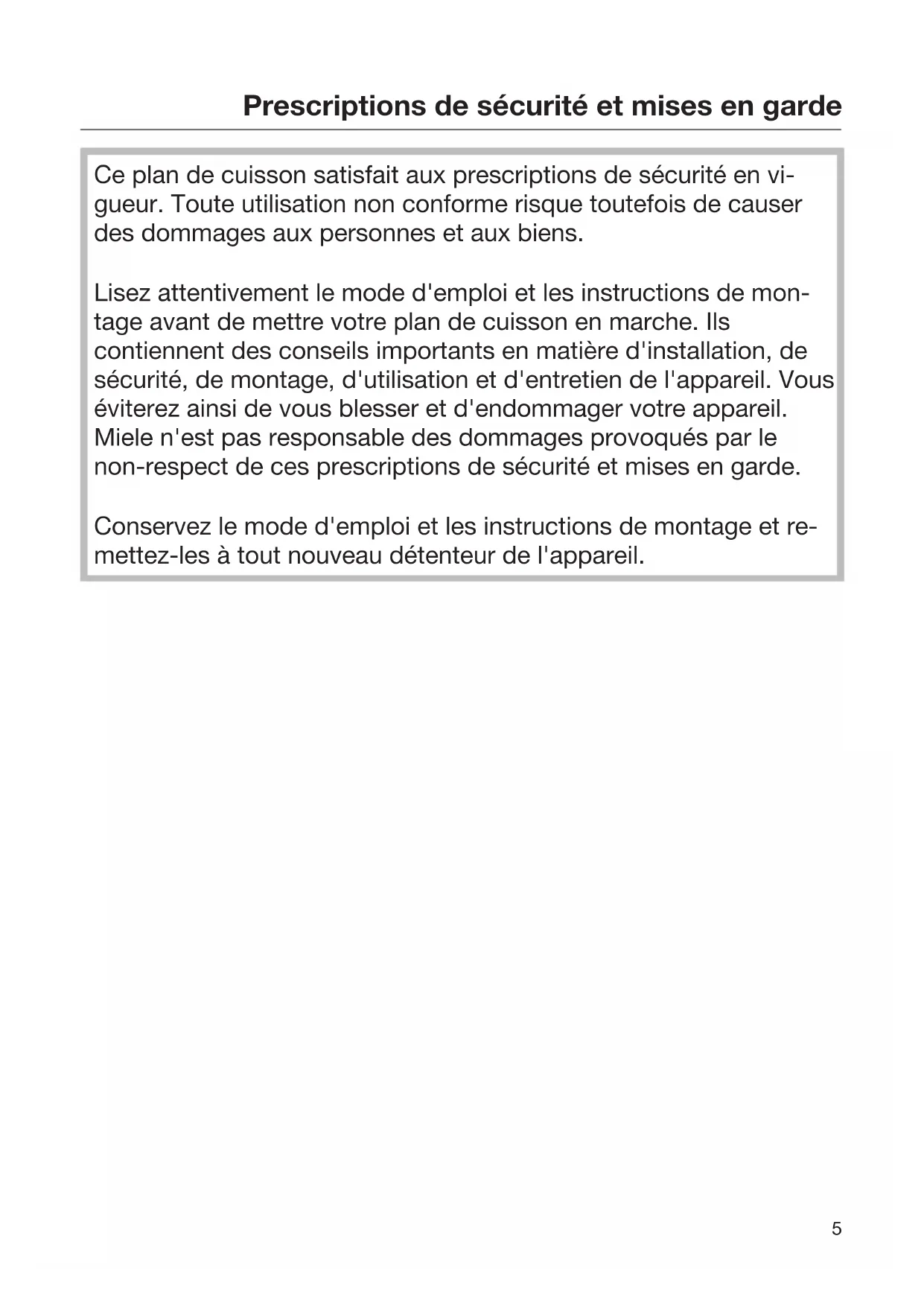 Ce plan de cuisson satisfait aux prescriptions de sécurité en vi- gueur. Toute utilisation non conforme risque toutefois de causer des dommages aux personnes et aux biens. Lisez attentivement le mode d'emploi et les instructions de mon- tage avant de mettre votre plan de cuisson en marche. Ils contiennent des conseils importants en matière d'installation, de sécurité, de montage, d'utilisation et d'entretien de l'appareil. Vous éviterez ainsi de vous blesser et d'endommager votre appareil. Miele n'est pas responsable des dommages provoqués par le non-respect de ces prescriptions de sécurité et mises en garde. Conservez le mode d'emploi et les instructions de montage et re- mettez-les à tout nouveau détenteur de l'appareil.Prescriptions de sécurité et mises en garde