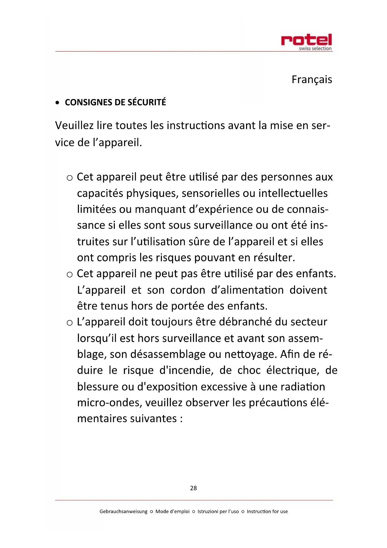 Pour une élimination dans les règles de l'art, veuillez remetre l'appareil à un reven-deur, un responsable du service après-vente ou Rotel SA.
