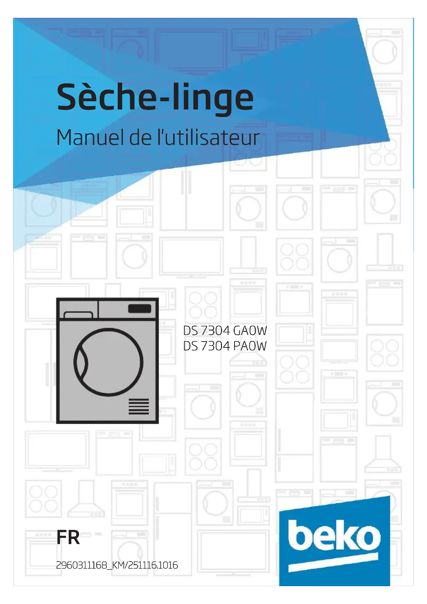Sèche-linge Manuel de l'utilisateur DS 7304 GA0W DS 7304 PA0W 2960311168_KM/251116.1016 FRVeuillez d’abord lire ce manuel ! Chère cliente, cher client, Nous vous remercions d’avoir choisi un appareil Beko. Nous espérons que votre appareil qui a été fabriqué avec des matériaux de haute qualité et une technologie de pointe vous offrira les meilleurs résultats. Nous vous conseillons de lire attentivement ce manuel et tout autre document fourni avant d’utiliser votre appareil et de le conserver à titre de référence. Si vous cédez l’appareil à quelqu’un d’autre, donnez-lui aussi le manuel. Prêtez attention à tous les détails et aux mises en garde indiquées dans le manuel d’utilisation et suivez les instructions qui y sont inscrites. Utilisez ce manuel d’utilisateur pour le modèle indiqué sur la page de couverture. Lisez les instructions. Explication des symboles Les symboles suivants sont utilisés tout au long du manuel d’utilisation :