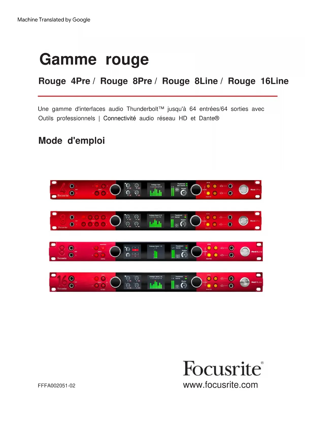 - Une gamme d'interfaces audio Thunderbolt™ jusqu'à 64 entrées/64 sorties avec Outils professionnels | Connectivité audio réseau HD et Dante® Mode d'emploi Gamme rouge Rouge 4Pre / Rouge 8Pre / Rouge 8Line / Rouge 16Line www.focusrite.com FFFA002051-02Machine Translated by GoogleLisez s'il vous plaît: téléchargements.focusrite.com Merci d'avoir téléchargé ce guide d'utilisation. Si vous préférez voir une version anglaise de ce guide de l'utilisateur pour utiliser votre propre outil de traduction, vous pouvez le trouver sur notre page de téléchargement : téléchargements.novationmusic.com Nous avons utilisé la traduction automatique pour nous assurer que nous avons un guide de l'utilisateur disponible dans votre langue, nous nous excusons pour toute erreur. Machine Translated by GoogleCONTENU Entrée de bouclage p. 15
