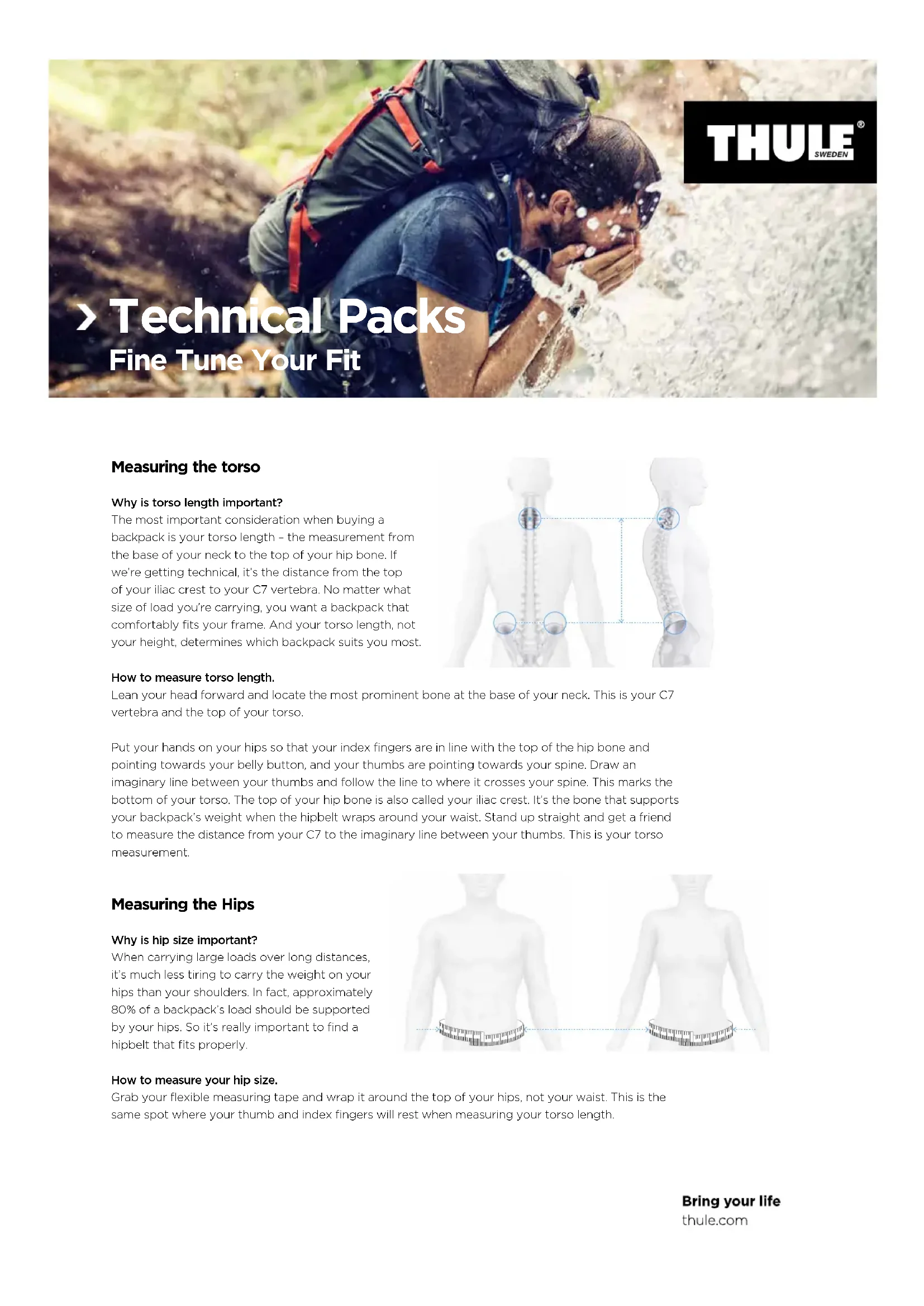 nužnestvari postavite na vrh ili u vanjske džepove ruksaka. Light Items Heavy Items Light Items Heavy ItemsSacs à dos techniques À votre mesure La mesure du torse En quoi la longueur du torse importe-t-elle? Parmi les facteurs à considérer lors de l’achat d’un sac à dos, le plus important est certes la longueur de votre torse, de la base du cou jusqu’au début de l’os iliaque. En termes techniques, il s’agit de la distance mesurée à partir du dessus de votre crête iliaque, jusqu’à votre vertèbreC7. Peu importe la charge que vous transportez, vous voulez que votre sac à dos épouse confortablement votre carrure. C’est la longueur de votre torse, et non votre grandeur, qui détermine le sac qui vous convient le mieux.Comment mesurer la longueur de votre torse.Penchez votre tête vers l’avant et localisez l’os le plus proéminent, à la base de votre cou. Ils’agitde votre vertèbreC7 et, par conséquent, de l’extrémité supérieure de votre torse.Placez vos mains sur vos hanches de sorte que vos index forment une ligne avec le bord supérieur de votre os iliaque et pointent vers votre nombril, et que vos pouces pointent vers votre colonne vertébrale. Imaginez une ligne qui relie vos deux pouces et remarquez l’endroit où cette ligne croise votre colonne vertébrale. Ce point correspond à la limite inférieure de votre torse. Le bord supérieur de votre os iliaque est aussi appelé crête iliaque. Cet os supporte le poids de votre sac à dos lorsque vous en attachez la ceinture à votre taille. Levez-vous bien droit et demandez àquelqu’un de mesurer la distance entre votre vertèbreC7 et la ligne imaginaire entre vos pouces. Vous obtiendrez alors votre longueur de torse. La mesure des hanches En quoi la largeur des hanches importe-t-elle? Lorsque vous transportez de lourdes charges sur de longues distances, il est bien moins fatigant d’en porter le poids sur vos hanches que sur vos épaules. En fait, vos hanches devraient supporter environ80% du poids dusac. Il est donc primordial de trouver unsacmuni d’une ceinture bien ajustée.Comment mesurer la largeur de vos hanches.Prenez un ruban à mesurer et enroulez-le autour de vos hanches, et pas de votre taille. C’estlàlemême endroit où vos pouces et index étaient placés lorsque vous avez mesuré lalongueur de votre torse. INCH