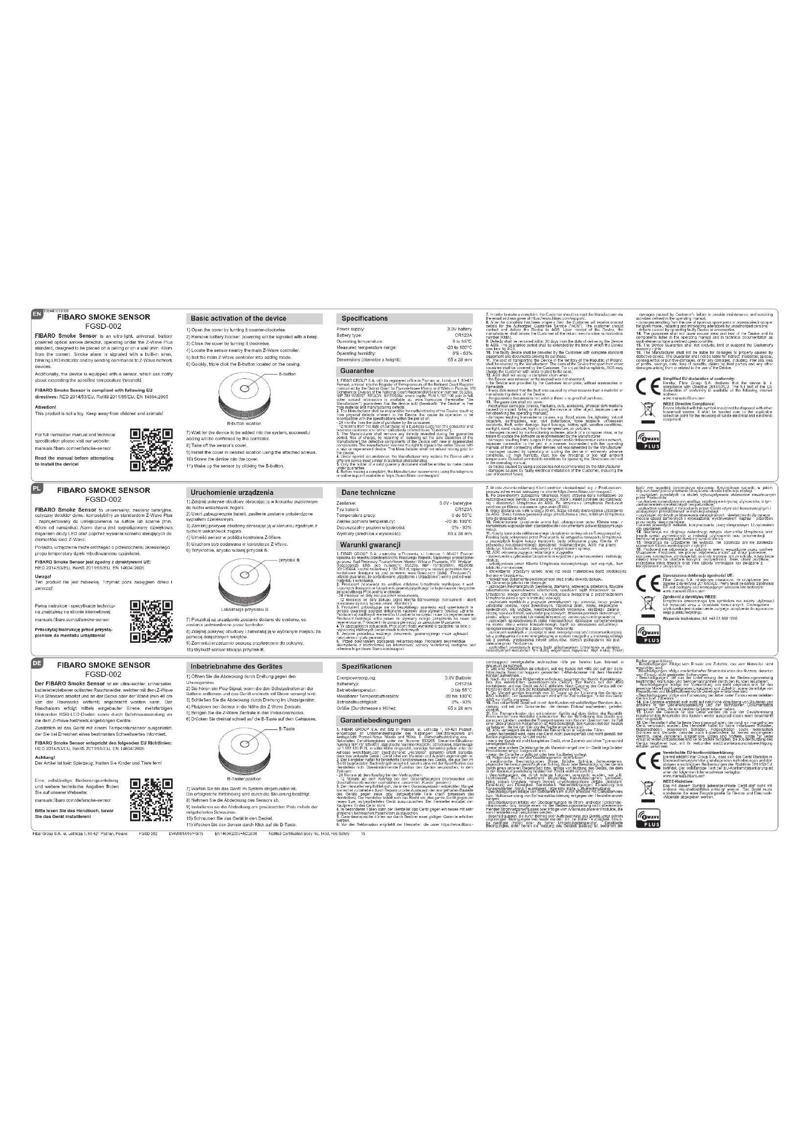 FIBARO Smoke Sensor é um dispositivo ótico de deteção de fumo, ultra compacto, que funciona no protocolo Z-Wave Plus. Opera a baterias e está desenhado para ser instalado no teto ou na parede (min. 40 cm a contar do canto). Um alarme de incêndio é sinalizado, acusticamente pela sirene interna, pelo piscar do LED e pelo envio de comandos aos dispositivos da rede Z-Wave. Adicionalmente, o dispositivo está equipado com um sensor que pode reportar o ultrapassar de um limiar de temperatura pré-definido. FIBARO Smoke Sensor cumpre com as seguintes diretivas da UE: RED 2014/53/EU, RoHS 2011/65/EU, EN 14604:2005 Cuidado! Este produto não é um brinquedo. Mantenha longe de crianças e animais! Garantia 1. FIBAR GROUP S.A. (“Fabricante”) com sede social na ul. Lotnicza 1, 60-421 Poznań, inscrita no Registo Judicial Nacional da República de Polónia gerado por Tribunal Distrital em Poznań Nowe Miasto e Wilda, XIII Divisão Comercial do Registo Judicial Nacional sob número 553265, NIF 7811858097, REGON 301595664, capital social de 1 182 100 PLN pagado na sua totalidade, outros dados de contato disponível sob: www.fibaro.com garante o Aparelho vendido („Aparelho”) está livre dos defeitos de material ou de produção).2. O funcionamento defeituoso do Aparelho que não conformará com a informação comunicada por Fabricante que seja resultado dos defeitos físicos do Aparelho será considerado a responsabilidade de Fabricante no período de:- 24 meses da data de compra pelo consumidor,- 12 meses da data de compra pelo comerciante (consumidor e comerciante serão em adelante junto denominados como „Cliente”.3. Após deste período de garantia, Fabricante deve remover gratuitamente os defeitos por meios de reparar ou substituir (após avaliação feita por Fabricante) todas as peças defeituosas do Aparelho com peças novas ou revitalizadas. Fabricante reserva o direito a substituir o Aparelho inteiro com um Aparelho novo ou revitalizado. Fabricante não reembolsará o Cliente. 4. Nos casos particulares Fabricante pode substituir o Aparelho com um quais parámetros técnicos serão semelhantes. 5. Apenas o proprietário do documento da garantia válido pode apresentar reclamações.6. Antes de apresentar uma reclamação, Fabricante recomenda contatar o Auxilio ao Cliente, via telefono ou e-mail na página Web: https://www.fibaro.com/support.7. Para apresentar uma reclamação Cliente deve contatar o Fabricante por e-mail no endereço mencionado na página Web: https://www.fibaro.com/support. Para visualizar o manual de instruções e especificações técnicas completas por favor aceda ou website: manuals.fibaro.com/pt/smoke-sensor Leia o manual antes de tentar instalar o dispositivo! Botão B Localização do botão B S-v2.48. Après la présentation de la demande d'activation de garantie valide, le Client recevra des informations de contact pour le Service de garantie autorisé (« SGA »). Le client doit s’adresser au SGA et y fournir l’Appareil. Après avoir obtenu l’Appareil, le Fabricant communiquera au Client le numéro d'application unique (RMA).9. Les vices seront éliminés dans un délai de 30 jours à compter de la date de livraison de l’Appareil au SGA. La période de garantie est prolongée du temps pendant lequel le dispositif restait à la disposition du SGA.10. L’appareil étant l’objet d’une réclamation doit être mis à disposition par le Client avec l’équipement standard complet et les documents confirmant son achat.11. Les frais de transport de l’Appareil étant l’objet d’une réclamation sur le territoire polonais seront couverts par le Fabricant. Dans le cas du transport d'autres pays, les frais de transport seront à la charge du Client. Dans le cas d'une notification de la demande de réclamation injustifiée, le SGA a le droit de charger le Client des frais concernant l'explication de la question.12. SGA refuse d'accepter une réclamation en cas de : - constatation de l’utilisation abusive et non conforme au mode d’emploi de l’Appareil,- mettre à disposition l’Appareil incomplet, sans accessoires, sans plaque signalétique de la part du Client, - déterminer la cause du défaut autre que le vice de matériau ou de production de l’Appareil, - du document de garantie non valable et l'absence de preuve d'achat.13. La garantie de qualité ne couvre pas :- des dommages mécaniques (fissures, fractures, coupures, écorchures, déformation physique due à l'impact, la chute ou causée en laissant tomber sur l'Appareil un autre objet ou par l’utilisation abusive de l’Appareil par rapport de celle prévue dans le mode d’emploi);- des dommages causés par des causes externes telles que: inondation, tempête, feu, foudre, catastrophes naturelles, tremblements de terre, guerre, troubles civils, cas de force majeure, accidents imprévus, vol, versement de liquide, fuite de la batterie, conditions météorologiques; lumière du soleil, sable, humidité, température élevée ou faible, pollution de l'air;- des dommages causés par un logiciel défectueux en raison d'une attaque de virus ou de ne pas mettre à jour du logiciel, l’opération recommandée par le fabricant;- des dommages résultant de : surtensions dans le réseau électrique et/ou de télécommunication ou de se connecter au réseau énergétique d'une manière incompatible avec les instructions ou à cause de la connexion d'autres produits dont la connexion n’est pas recommandée par le fabricant;- des dommages causés par le fonctionnement ou le stockage dans des conditions extrêmement défavorables, soit humidité élevée, poussière, température ambiante trop basse (gel) ou trop haute. Les conditions détaillées dans lesquelles il est possible d'utiliser l'appareil détermine le mode d’emploi ;- les dommages causés par l'utilisation d'accessoires non recommandés par le Fabricant;- des dommages causés par réseau électrique défectueux de l