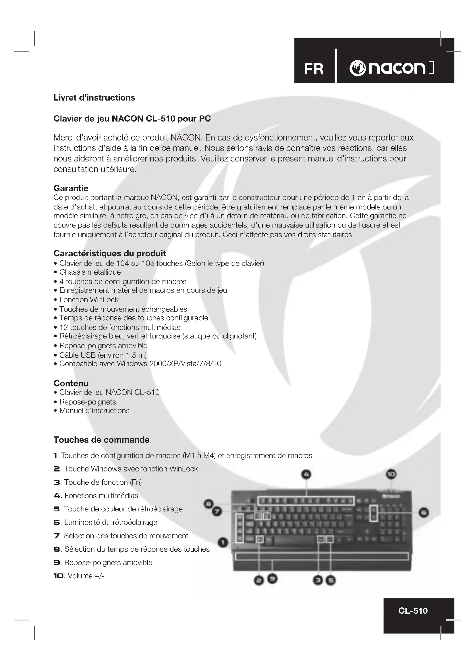 CL-510 Livret d’instructions Clavier de jeu NACON CL-510 pour PC Merci d’avoir acheté ce produit NACON. En cas de dysfonctionnement, veuillez vous reporter aux instructions d’aide à la fi n de ce manuel. Nous serions ravis de connaître vos réactions, car elles nous aideront à améliorer nos produits. Veuillez conserver le présent manuel d’instructions pour consultation ultérieure. Garantie Ce produit portant la marque NACON, est garanti par le constructeur pour une période de 1 an à partir de la date d’achat, et pourra, au cours de cette période, être gratuitement remplacé par le même modèle ou un modèle similaire, à notre gré, en cas de vice dû à un défaut de matériau ou de fabrication. Cette garantie ne couvre pas les défauts résultant de dommages accidentels, d’une mauvaise utilisation ou de l’usure et est fournie uniquement à l’acheteur original du produit. Ceci n’aff ecte pas vos droits statutaires. Caractéristiques du produit