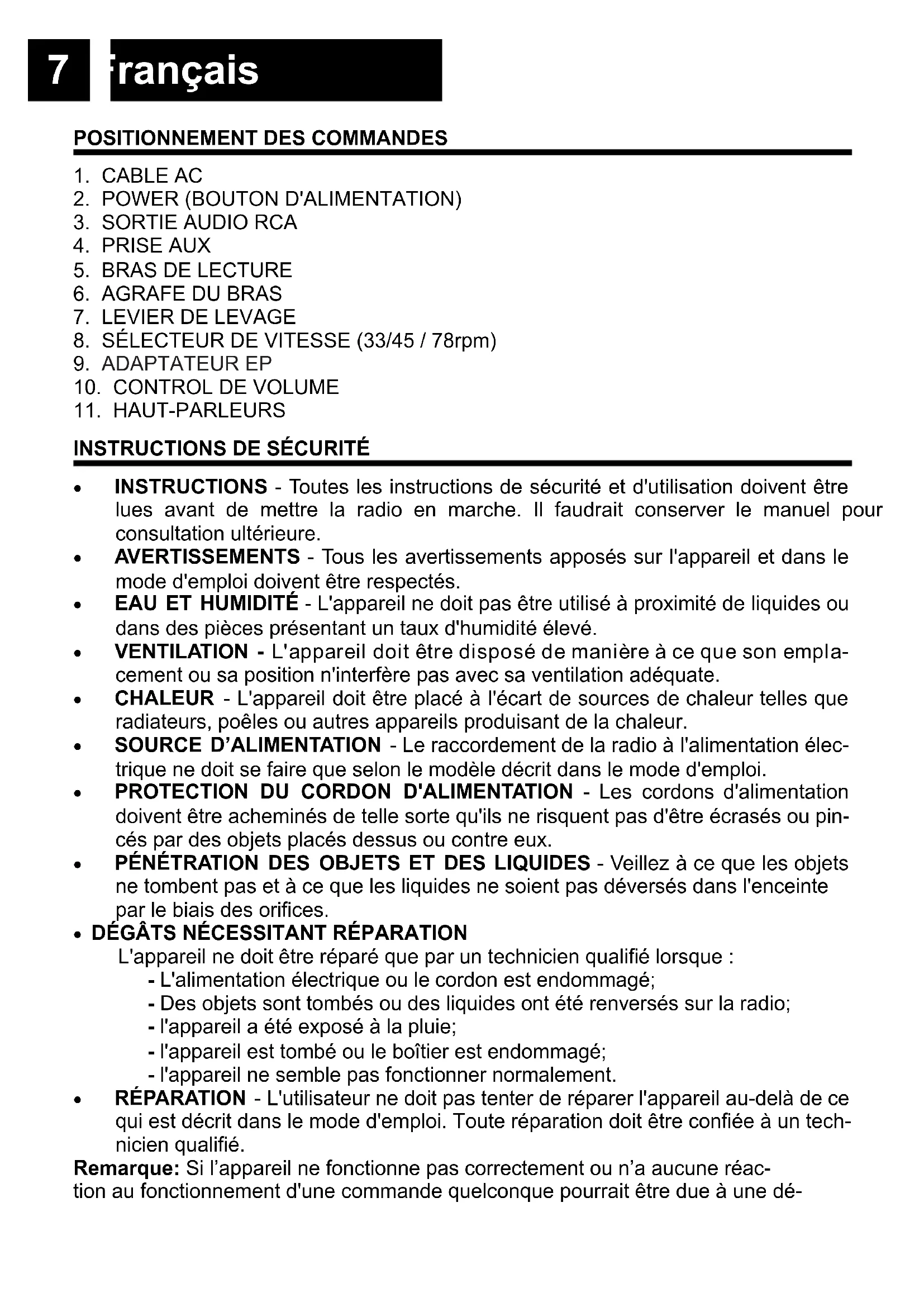 INSTRUCTIONS - Toutes les instructions de sécurité et d'utilisation doivent être lues avant de mettre la radio en marche. Il faudrait conserver le manuel pour consultation ultérieure. AVERTISSEMENTS - Tous les avertissements apposés sur l'appareil et dans le mode d'emploi doivent être respectés. EAU ET HUMIDITÉ - L'appareil ne doit pas être utilisé à proximité de liquides ou dans des pièces présentant un taux d'humidité élevé. VENTILATION - L'appareil doit être disposé de manière à ce que son empla- cement ou sa position n'interfère pas avec sa ventilation adéquate. CHALEUR - L'appareil doit être placé à l'écart de sources de chaleur telles que radiateurs, poêles ou autres appareils produisant de la chaleur. SOURCE D’ALIMENTATION - Le raccordement de la radio à l'alimentation élec- trique ne doit se faire que selon le modèle décrit dans le mode d'emploi. PROTECTION DU CORDON D'ALIMENTATION - Les cordons d'alimentation doivent être acheminés de telle sorte qu'ils ne risquent pas d'être écrasés ou pin- cés par des objets placés dessus ou contre eux. PÉNÉTRATION DES OBJETS ET DES LIQUIDES - Veillez à ce que les objets ne tombent pas et à ce que les liquides ne soient pas déversés dans l'enceinte par le biais des orifices. DÉGÂTS NÉCESSITANT RÉPARATION L'appareil ne doit être réparé que par un technicien qualifié lorsque : - L'alimentation électrique ou le cordon est endommagé; - Des objets sont tombés ou des liquides ont été renversés sur la radio; - l'appareil a été exposé à la pluie; - l'appareil est tombé ou le boîtier est endommagé; - l'appareil ne semble pas fonctionner normalement. RÉPARATION - L'utilisateur ne doit pas tenter de réparer l'appareil au-delà de ce qui est décrit dans le mode d'emploi. Toute réparation doit être confiée à un tech- nicien qualifié. Remarque: Si l’appareil ne fonctionne pas correctement ou n’a aucune réac- tion au fonctionnement d'une commande quelconque pourrait être due à une dé-8 Français charge électrostatique, éteindre, débrancher le cordon d'alimentation CA, puis re- mettre l'appareil sous tension après quelques secondes. SOURCES D'ALIMENTATION ALIMENTATION CA : Pour alimenter la chaîne stéréo portative, il suffit de bran- cher le cordon d'alimentation CA dans la prise CA (1) située à l'arrière de l'appareil et dans une prise de courant CA murale. Vérifier que la tension nominale de l`appareil correspond à la tension locale. Vérifier que le cordon d'alimentation CA est complètement inséré dans l'appareil. TOURNE-DISQUES
