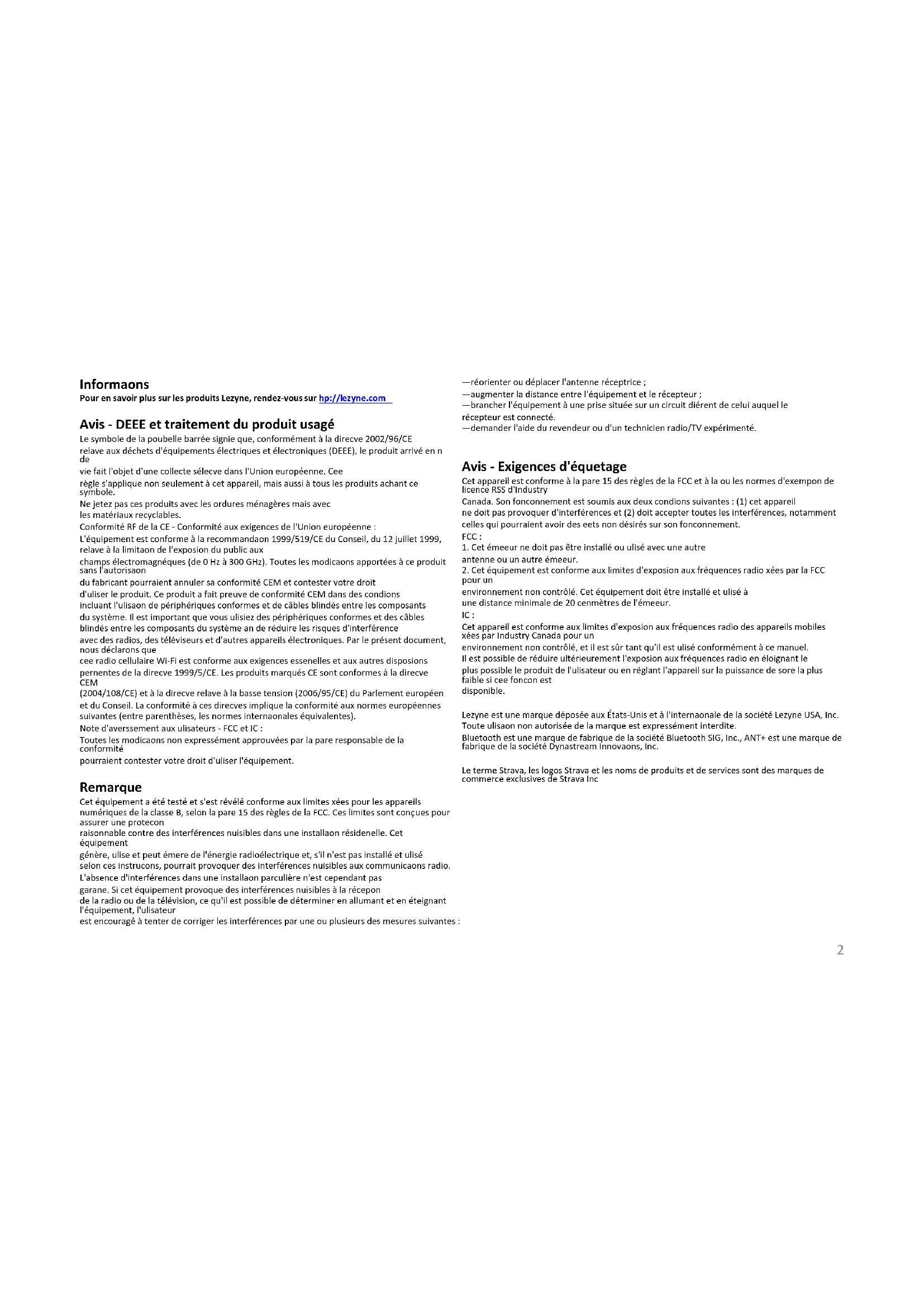 Ce produit est conçu uniquement pour aider les cyclistes et ne doit pas être utilisé pour obtenir une mesure précise de la direcon, de la distance, de la posion ou de la topographie. Lezyne ne garant ni la précision ni l'exhausvité des données cartographiques de ce produit.