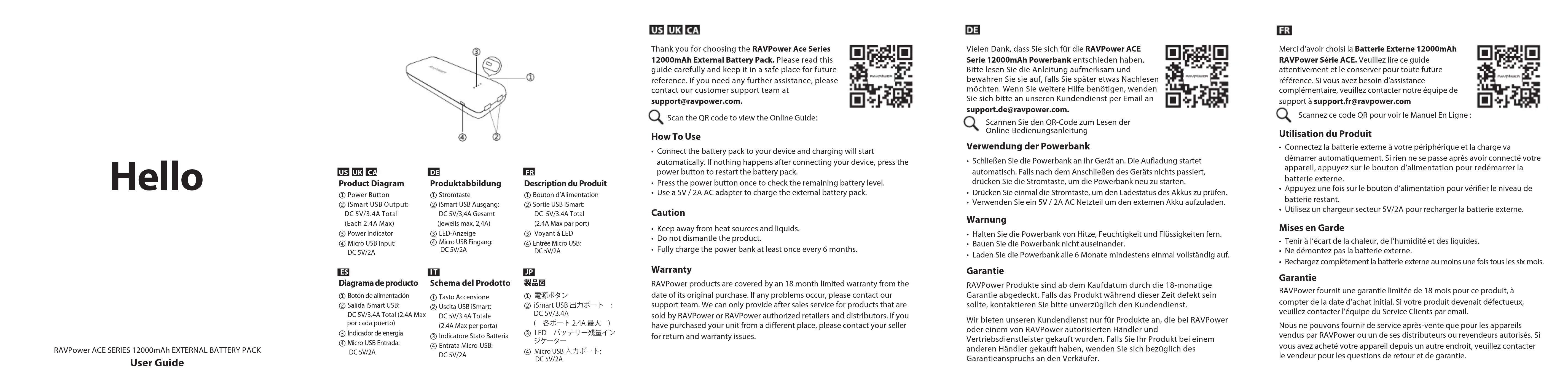 User Guide Hello RAVPower ACE SERIES 12000mAh EXTERNAL BATTERY PACK Merci d’avoir choisi la Batterie Externe 12000mAh RAVPower Série ACE. Veuillez lire ce guide attentivement et le conserver pour toute future référence. Si vous avez besoin d’assistance complémentaire, veuillez contacter notre équipe de support à support.fr@ravpower.com Scannez ce code QR pour voir le Manuel En Ligne : Utilisation du Produit