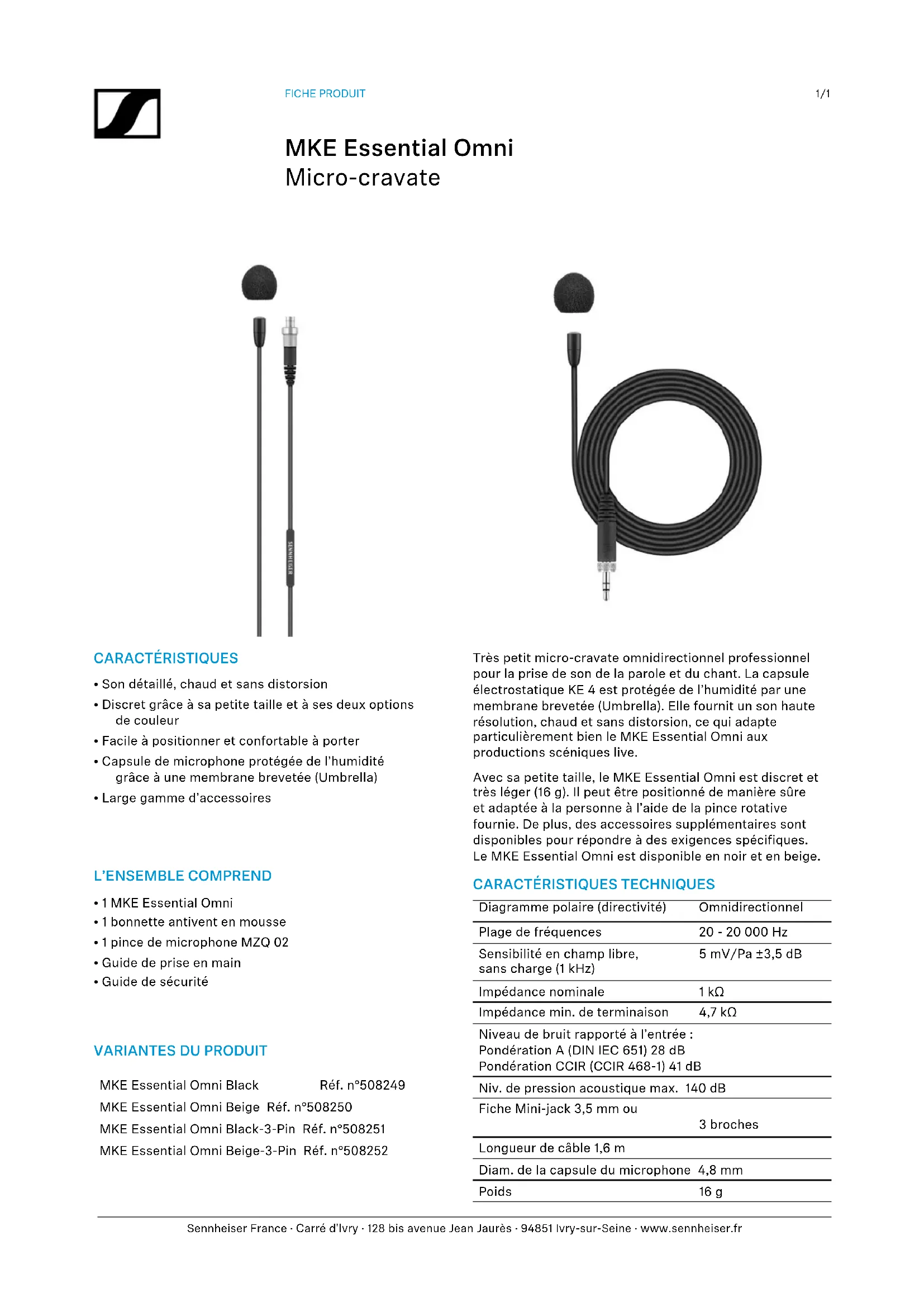 - Guide de sécurité Très petit micro-cravate omnidirectionnel professionnel pour la prise de son de la parole et du chant. La capsule électrostatique KE 4 est protégée de l’humidité par une membrane brevetée (Umbrella). Elle fournit un son haute résolution, chaud et sans distorsion, ce qui adapte particulièrement bien le MKE Essential Omni aux productions scéniques live. Avec sa petite taille, le MKE Essential Omni est discret et très léger (16 g). Il peut être positionné de manière sûre et adaptée à la personne à l’aide de la pince rotative fournie. De plus, des accessoires supplémentaires sont disponibles pour répondre à des exigences spécifiques. Le MKE Essential Omni est disponible en noir et en beige.
