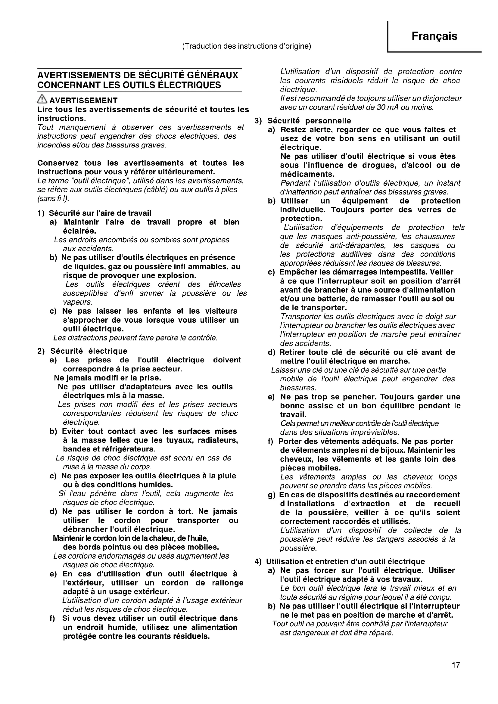 AVERTISSEMENT Lire tous les avertissements de sécurité et toutes les instructions. Tout manquement à observer ces avertissements et instructions peut engendrer des chocs électriques, des incendies et/ou des blessures graves. Conservez tous les avertissements et toutes les instructions pour vous y référer ultérieurement. Le terme "outil électrique", utilisé dans les avertissements, se réfère aux outils électriques (câblé) ou aux outils à piles (sans fi l).