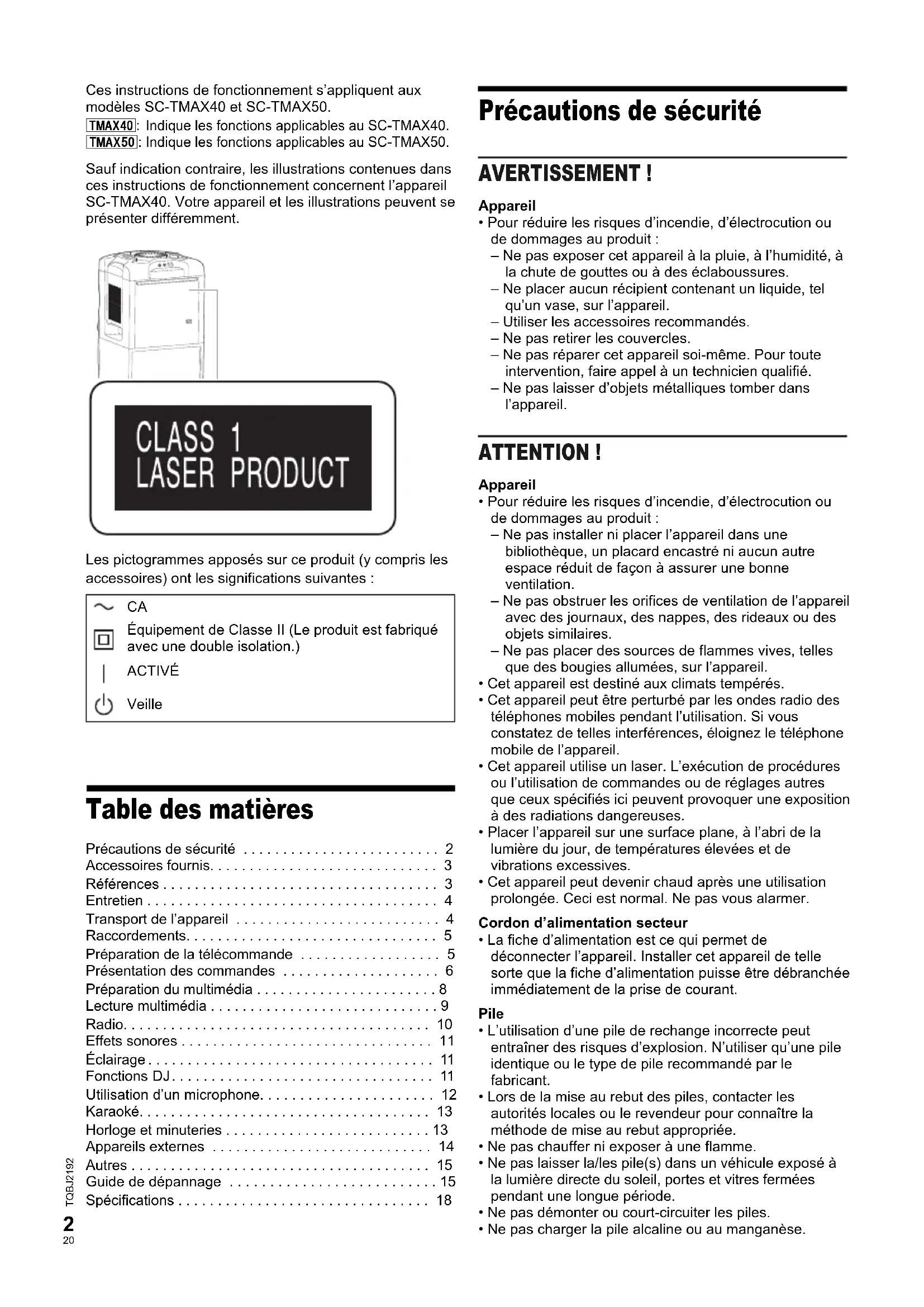 - TQBJ2192 Ces instructions de fonctionnement s’appliquent aux modèles SC-TMAX40 et SC-TMAX50.Sauf indication contraire, les illustrations contenues dans ces instructions de fonctionnement concernent l’appareil SC-TMAX40. Votre appareil et les illustrations peuvent se présenter différemment.Les pictogrammes apposés sur ce produit (y compris les accessoires) ont les significations suivantes : Table des matières Précautions de sécurité p. 2