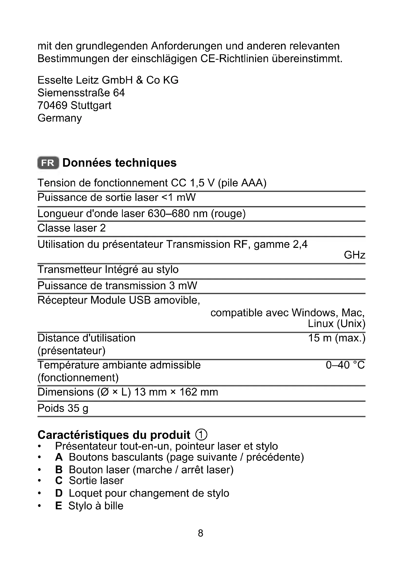 Données techniques Tension de fonctionnement CC 1,5 V (pile AAA) Puissance de sortie laser <1 mW Longueur d'onde laser 630–680 nm (rouge) Classe laser 2 Utilisation du présentateur Transmission RF, gamme 2,4 GHz Transmetteur Intégré au stylo Puissance de transmission 3 mW Récepteur Module USB amovible, compatible avec Windows, Mac, Linux (Unix) Distance d'utilisation (présentateur) 15 m (max.) Température ambiante admissible (fonctionnement) 0–40 °C Dimensions (Ø × L) 13 mm × 162 mm Poids 35 g Caractéristiques du produit