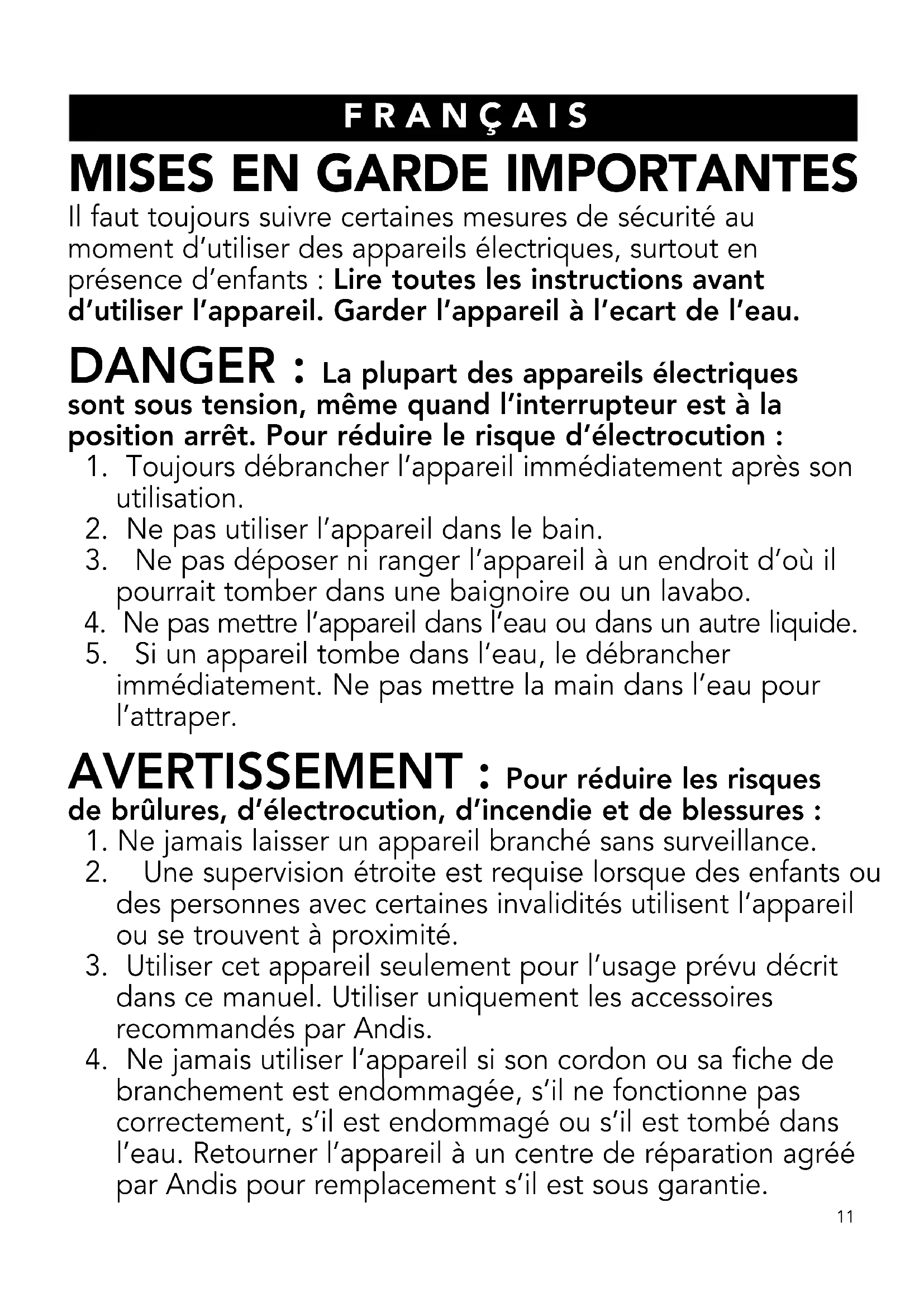 - Utiliser cet apparéil seulement pour l'usage prévu déscrit dans ce manuel. Utiliser uniquement les accessoires recommends par Andis.