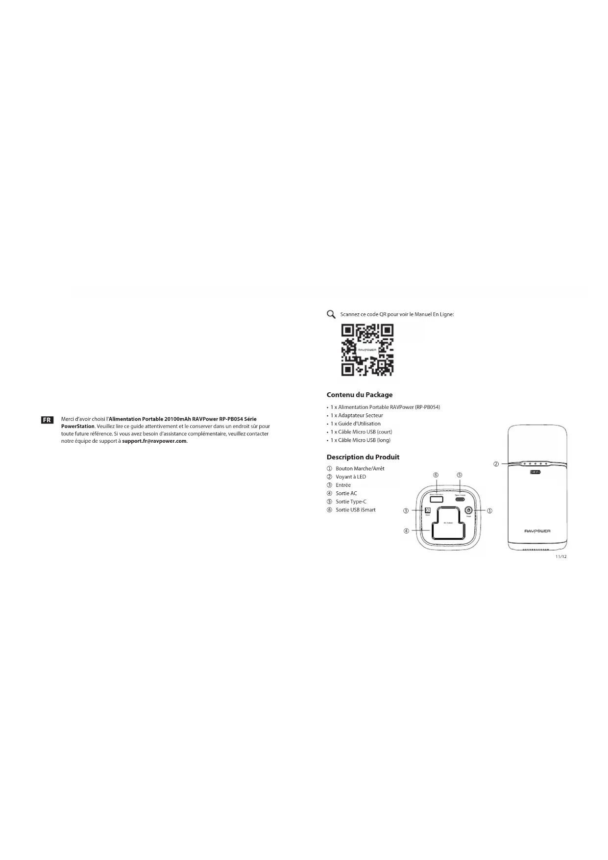 Merci d’avoir choisi l’Alimentation Portable 20100mAh RAVPower RP-PB054 Série PowerStation. Veuillez lire ce guide attentivement et le conserver dans un endroit sûr pour toute future référence. Si vous avez besoin d’assistance complémentaire, veuillez contacter notre équipe de support à support.fr@ravpower.com. Scannez ce code QR pour voir le Manuel En Ligne: