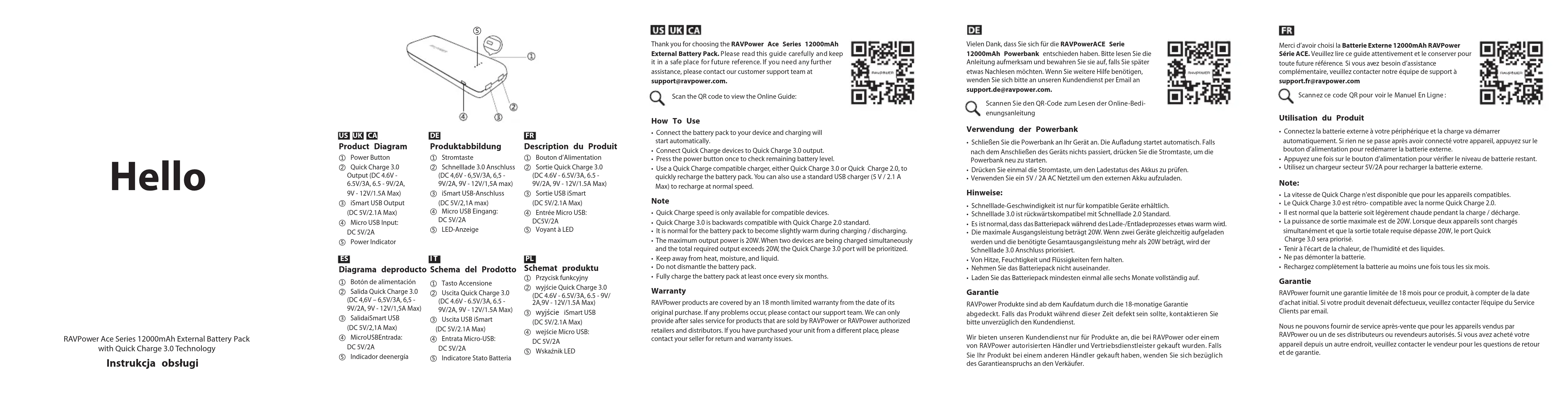 Instrukcja obsługi Hello RAVPower Ace Series 12000mAh External Battery Pack with Quick Charge 3.0 Technology Merci d’avoir choisi la Batterie Externe 12000mAh RAVPower Série ACE. Veuillez lire ce guide attentivement et le conserver pour toute future référence. Si vous avez besoin d’assistance complémentaire, veuillez contacter notre équipe de support à support.fr@ravpower.com Scannez ce code QR pour voir le Manuel En Ligne : Utilisation du Produit