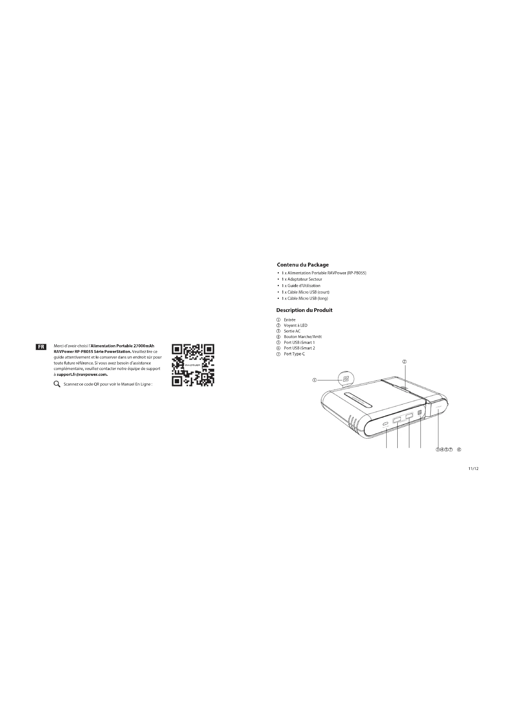 11/12 Merci d’avoir choisi l’Alimentation Portable 27000mAh RAVPower RP-PB055 Série PowerStation. Veuillez lire ce guide attentivement et le conserver dans un endroit sûr pour toute future référence. Si vous avez besoin d’assistance complémentaire, veuillez contacter notre équipe de support à support.fr@ravpower.com. Scannez ce code QR pour voir le Manuel En Ligne : Contenu du Package