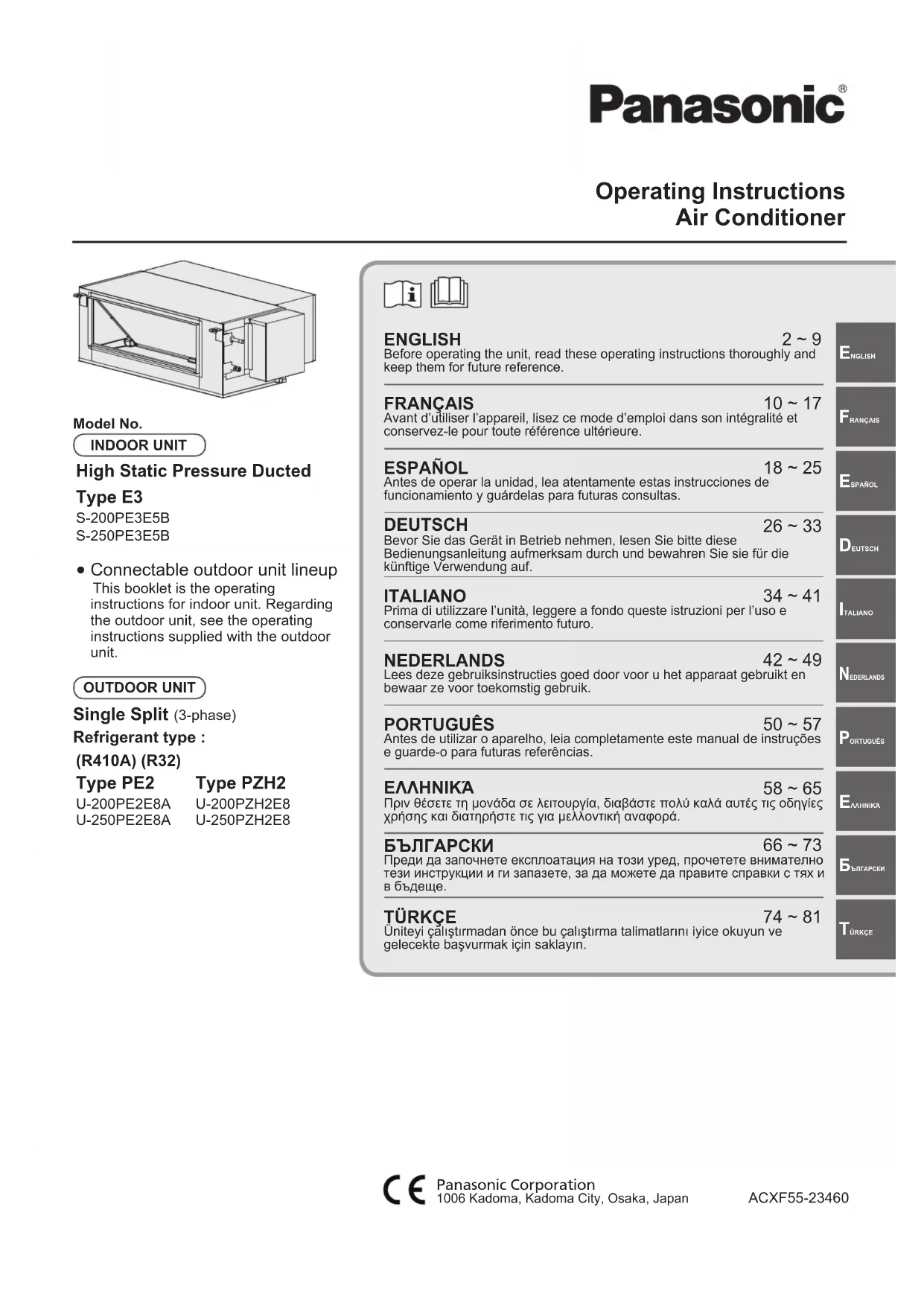 S250PE3E5B - Climatisation PANASONIC - Notice d'utilisation et mode d'emploi gratuit