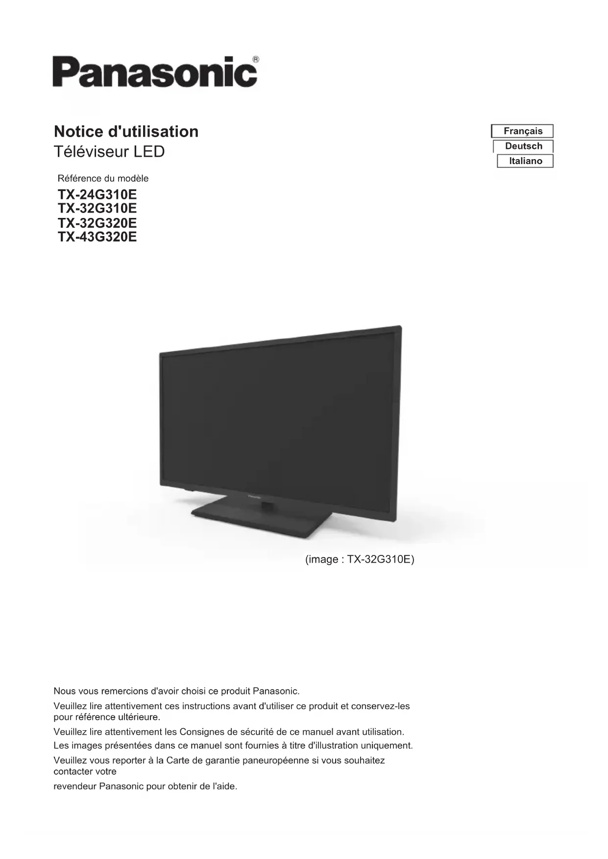 - Notice d'utilisation Téléviseur LED Référence du modèle TX-24G310E TX-32G310E TX-32G320E TX-43G320E Français Deutsch Italiano (image: TX-32G310E) Nous vous remercions d'avoir choisi ce produit Panasonic. Veuillez lire attentivement ces instructions avant d'utiliser ce produit et conservez-les pour référence ultérieure. Veuillez lire attentivement les Consignes de sécurité de ce manuel avant utilisation. Les images présentées dans ce manuel sont fournies à titre d'illustration uniquement. Veuillez vous reporter à la Carte de garantie paneuropéenne si vous souhaitez contacter votre revendeur Panasonic pour obtenir de l'aide. (image : TX-32G310E)2 Français Sauf indication contraire, les illustrations utilisées dans ce manuel correspondent au modèle TX-32G310E. Les illustrations peuvent être différentes selon le modèle. Sommaire Licence p. 2