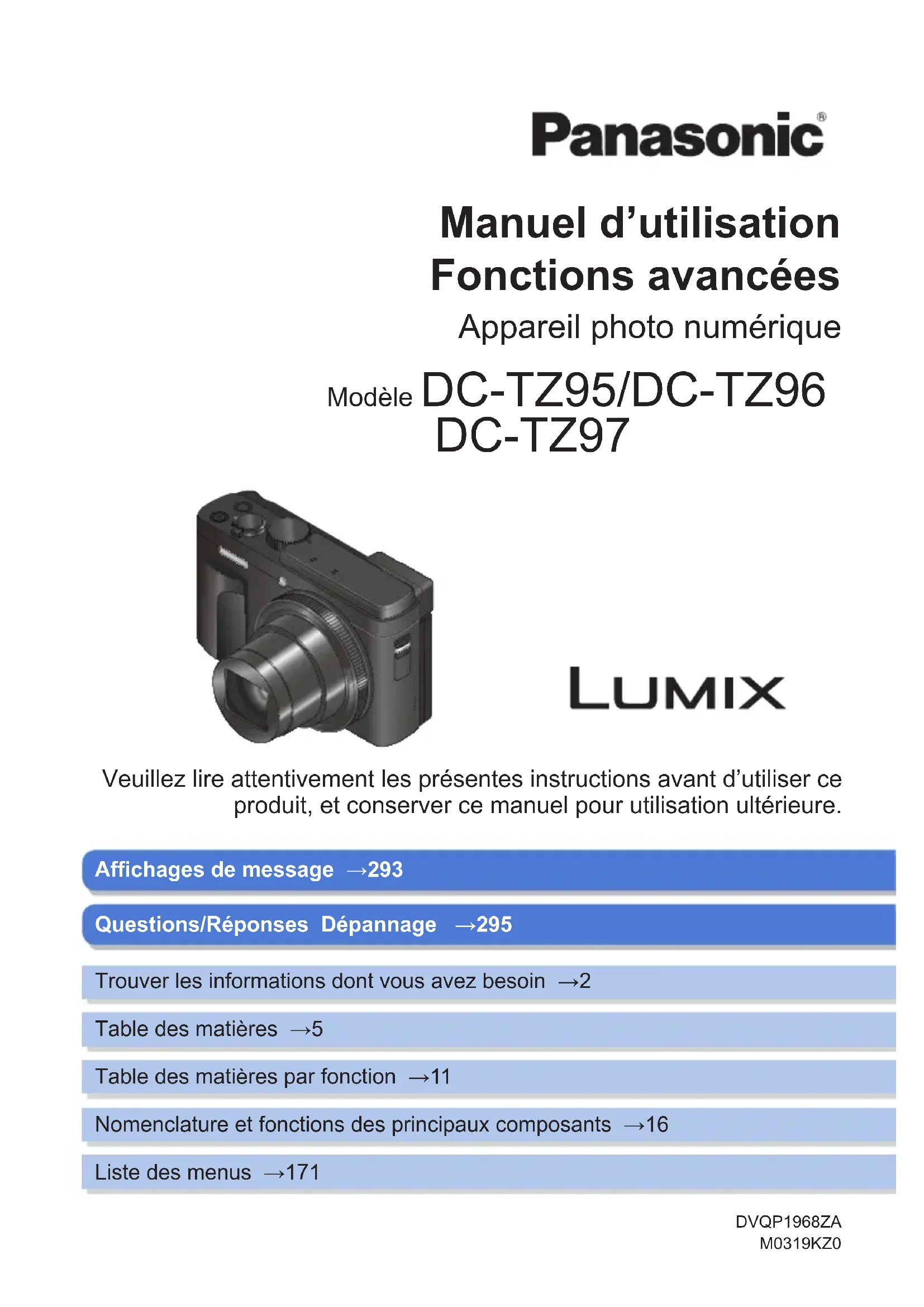Manuel d’utilisation Fonctions avancées Appareil photo numérique Modèle DC-TZ95/DC-TZ96 DC-TZ97 DVQP1968ZAM0319KZ0Affichages de message →293 Veuillez lire attentivement les présentes instructions avant d’utiliser ce produit, et conserver ce manuel pour utilisation ultérieure. Questions/Réponses Dépannage →295Trouver les informations dont vous avez besoin →2Table des matières →5Table des matières par fonction →11Liste des menus →171Nomenclature et fonctions des principaux composants →162 Trouver les informations dont vous avez besoin Dans ce « Manuel d’utilisation Fonctions avancées », vous trouverez les informations dont vous avez besoin dans les pages suivantes. Un clic sur un numéro de page permet de sauter jusqu’à la page liée et de rapidement trouver les informations. Recherche depuis « Table des matières »